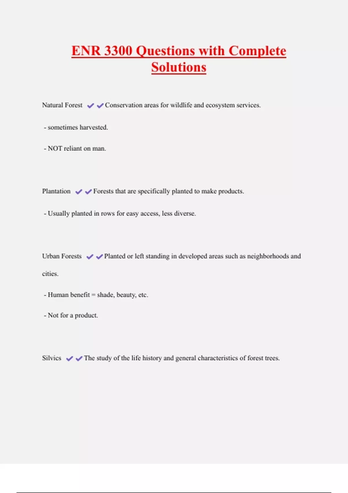 ENR 3300 Questions with Complete Solutions Natural Forest Conservation areas for wildlife and ecosystem services. - sometimes harvested. - NOT reliant on man. Plantation Forests that are specifically planted to make products. - Usually planted in rows for easy access, less diverse.