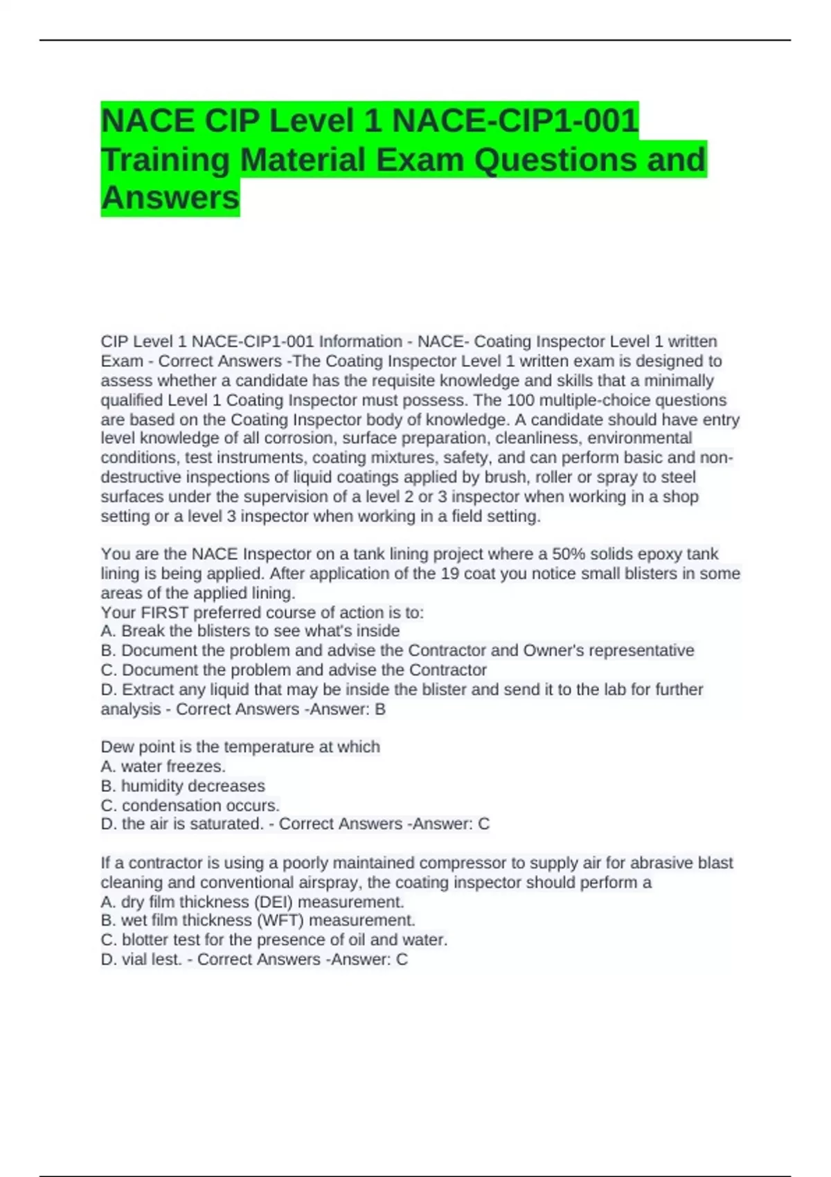 CIP Level 1 NACE-CIP1-001 Information - NACE- Coating Inspector Level 1 written