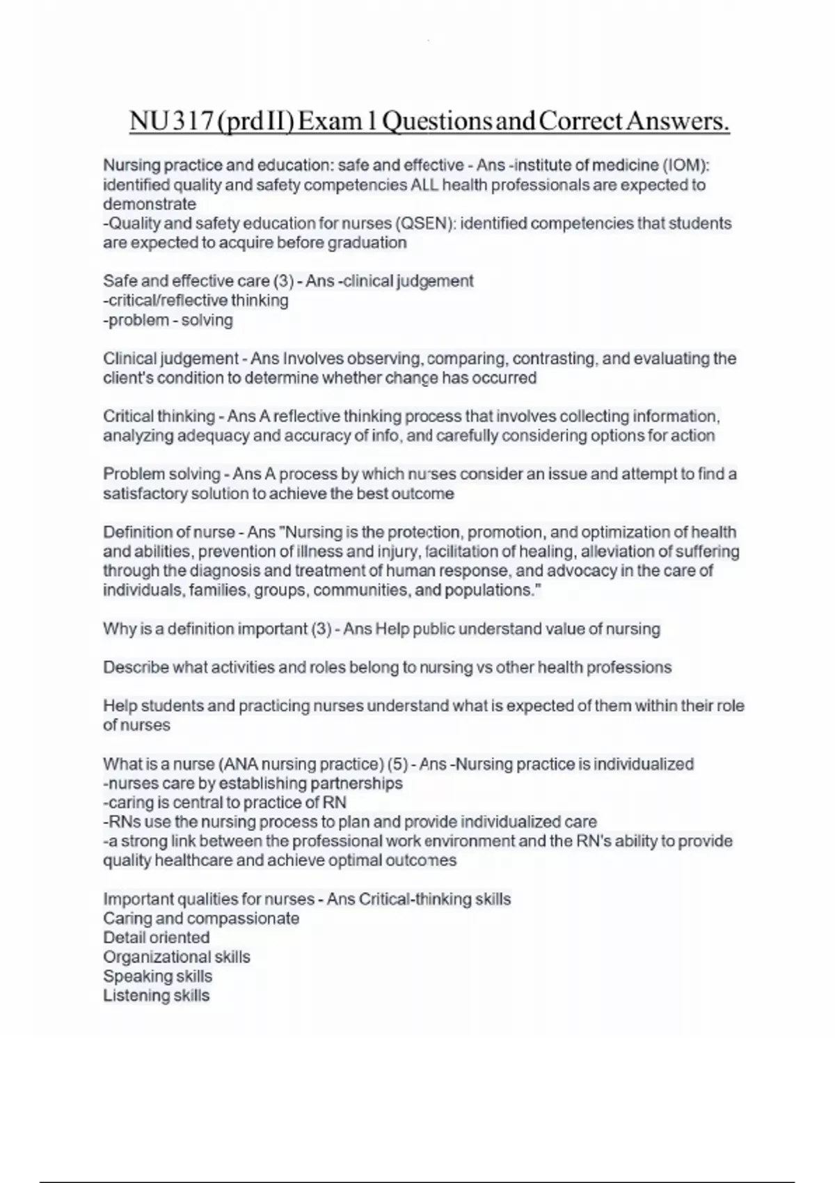 Nursing practice and education: safe and effective - Ans -institute of medicine (IOM): identified quality and safety competencies ALL health professionals are expected to demonstrate -Quality and safety education for nurses (QSEN): identified competencies that students are expected to acquire before graduation Safe and effective care (3) - Ans -clinical judgement -critical/reflective thinking -problem - solving Clinical judgement - Ans Involves observing, comparing, contrasting, and evaluating the client's condition to determine whether change has occurred