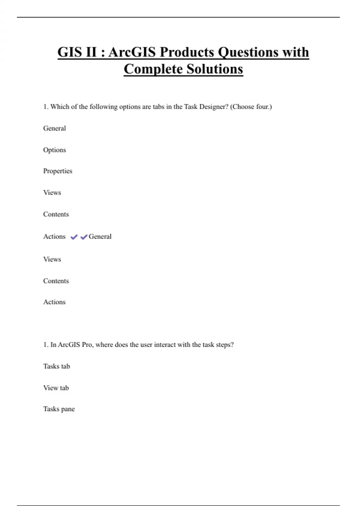 GIS II : ArcGIS Products Questions with Complete Solutions 1. Which of the following options are tabs in the Task Designer? (Choose four.) General Options Properties Views Contents Actions General Views Contents Actions