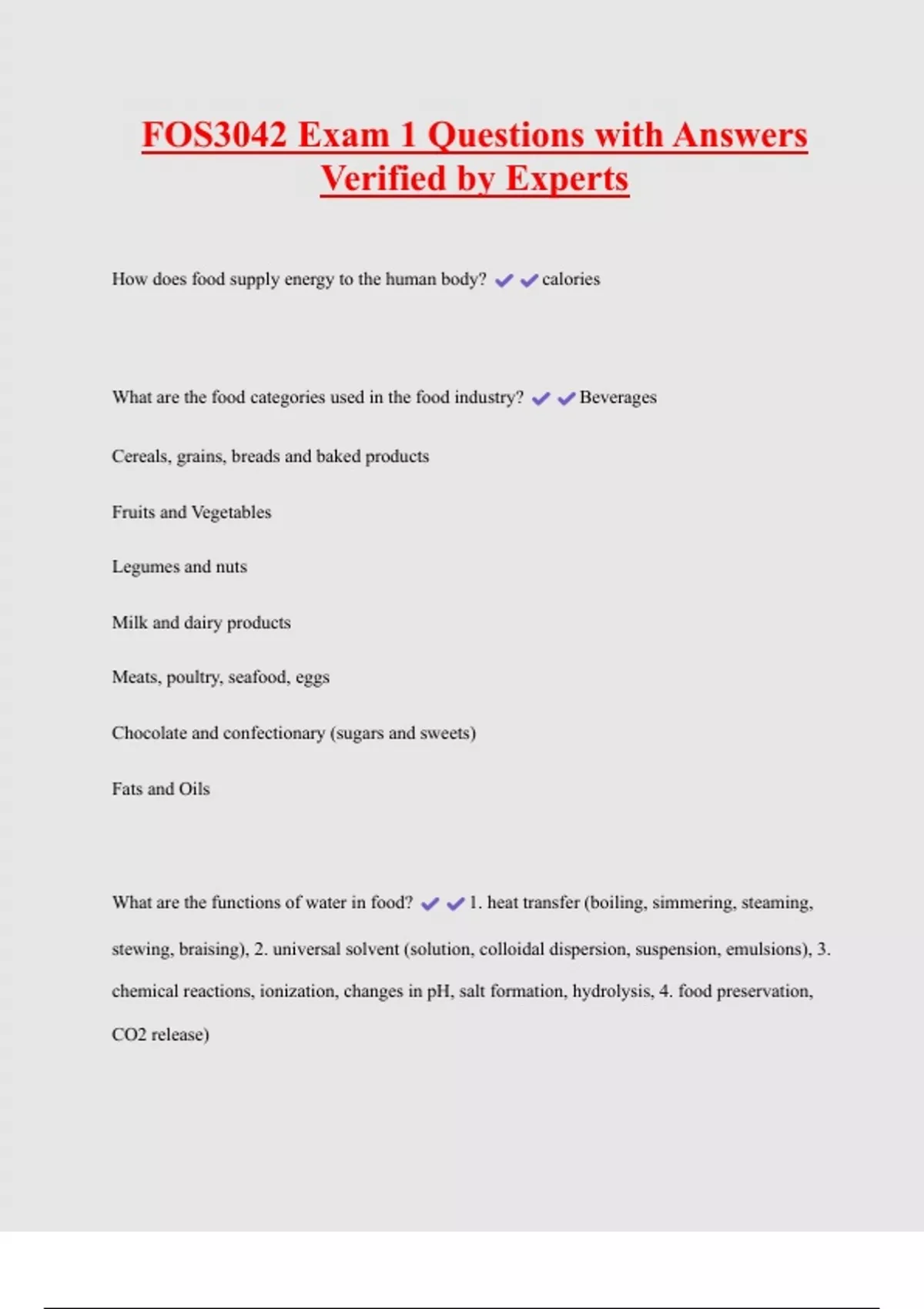 FOS3042 Exam 1 Questions with Answers Verified by Experts How does food supply energy to the human body? calories What are the food categories used in the food industry? Beverages Cereals, grains, breads and baked products Fruits and Vegetables Legumes and nuts Milk and dairy products Meats, poultry, seafood, eggs Chocolate and confectionary (sugars and sweets) Fats and Oils