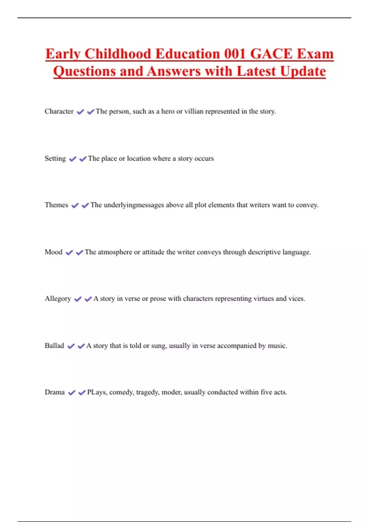 Early Childhood Education 001 GACE Exam Questions and Answers with Latest Update Character The person, such as a hero or villian represented in the story. Setting The place or location where a story occurs Themes The underlyingmessages above all plot elements that writers want to convey. Mood The atmosphere or attitude the writer conveys through descriptive languag