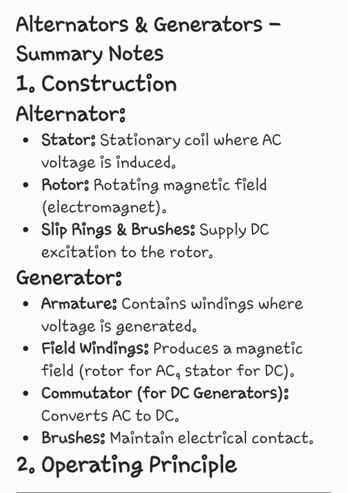 These notes summarize alternators and generators in terms of construction, operation, connections, types, applications, testing, protection, and calculations.