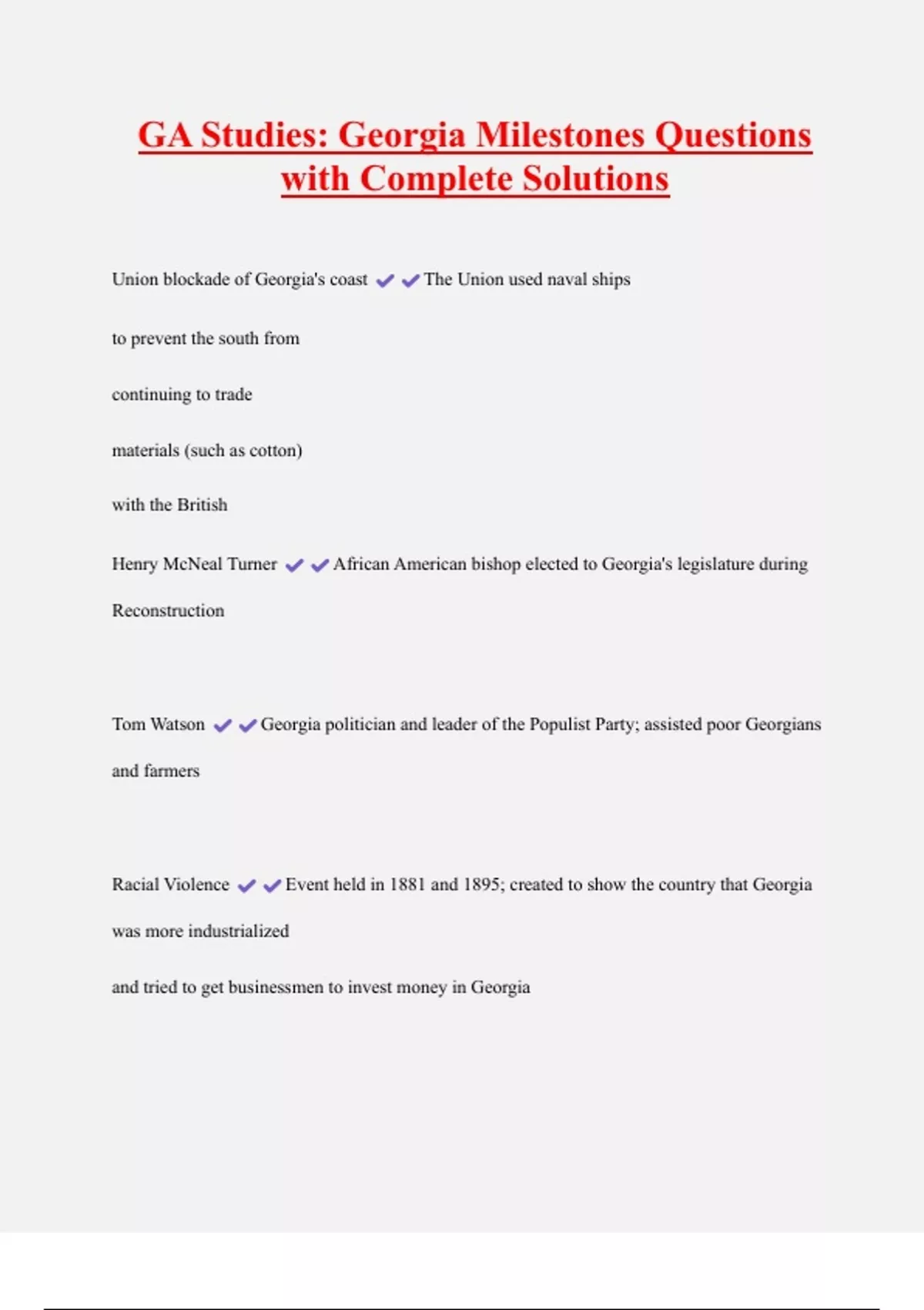 GA Studies: Georgia Milestones Questions with Complete Solutions Union blockade of Georgia's coast The Union used naval ships to prevent the south from continuing to trade materials (such as cotton) with the British Henry McNeal Turner African American bishop elected to Georgia's legislature during Reconstruction
