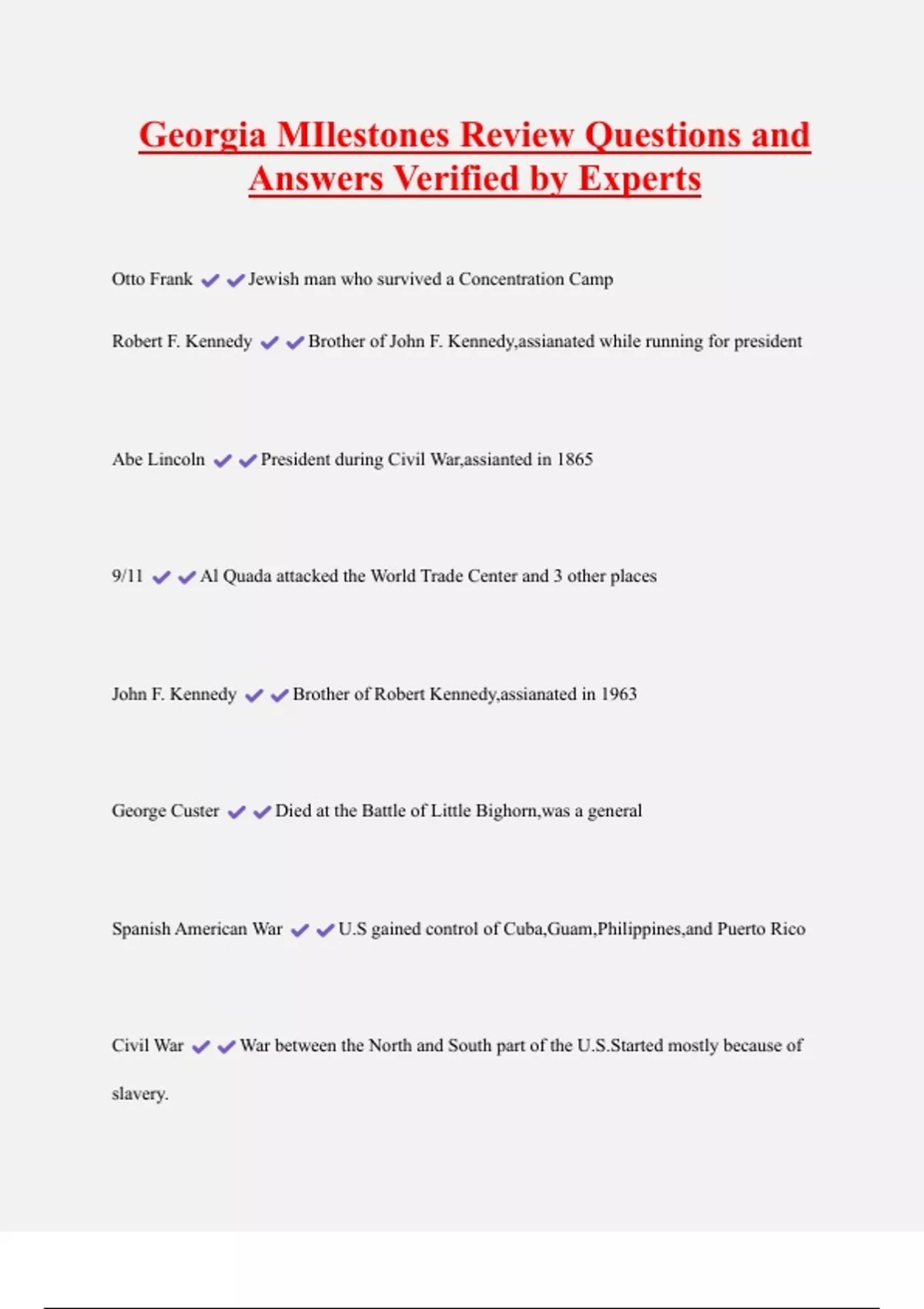 Georgia MIlestones Review Questions and Answers Verified by Experts Otto Frank Jewish man who survived a Concentration Camp Robert F. Kennedy Brother of John F. Kennedy,assianated while running for president Abe Lincoln President during Civil War,assianted in 1865 9/11 Al Quada attacked the World Trade Center and 3 other places