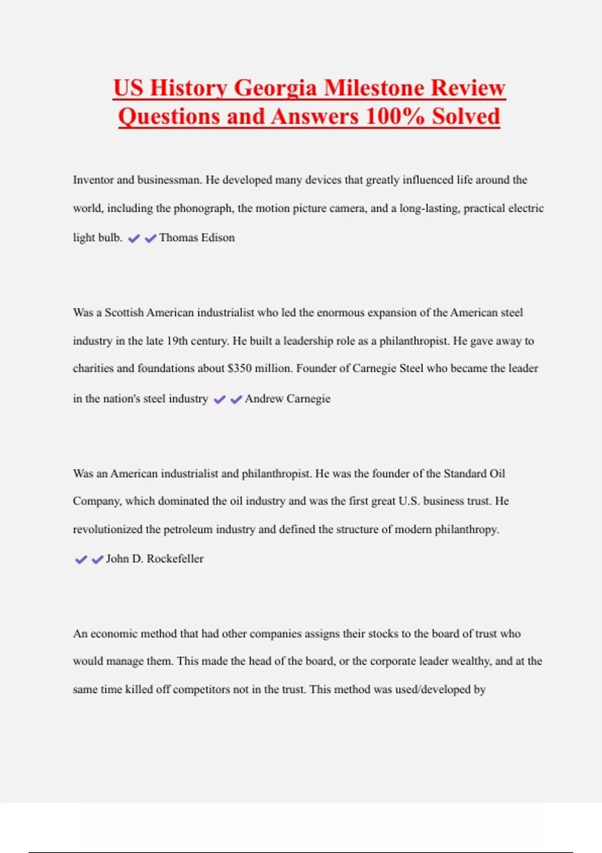 US History Georgia Milestone Review Questions and Answers 100% Solved Inventor and businessman. He developed many devices that greatly influenced life around the world, including the phonograph, the motion picture camera, and a long-lasting, practical electric light bulb. Thomas Edison Was a Scottish American industrialist who led the enormous expansion of the American steel industry in the late 19th century. He built a leadership role as a philanthropist. He gave away to charities and foundations about $350 million. Founder of Carnegie Steel who became the leader in the nation's steel industry Andrew Carnegie