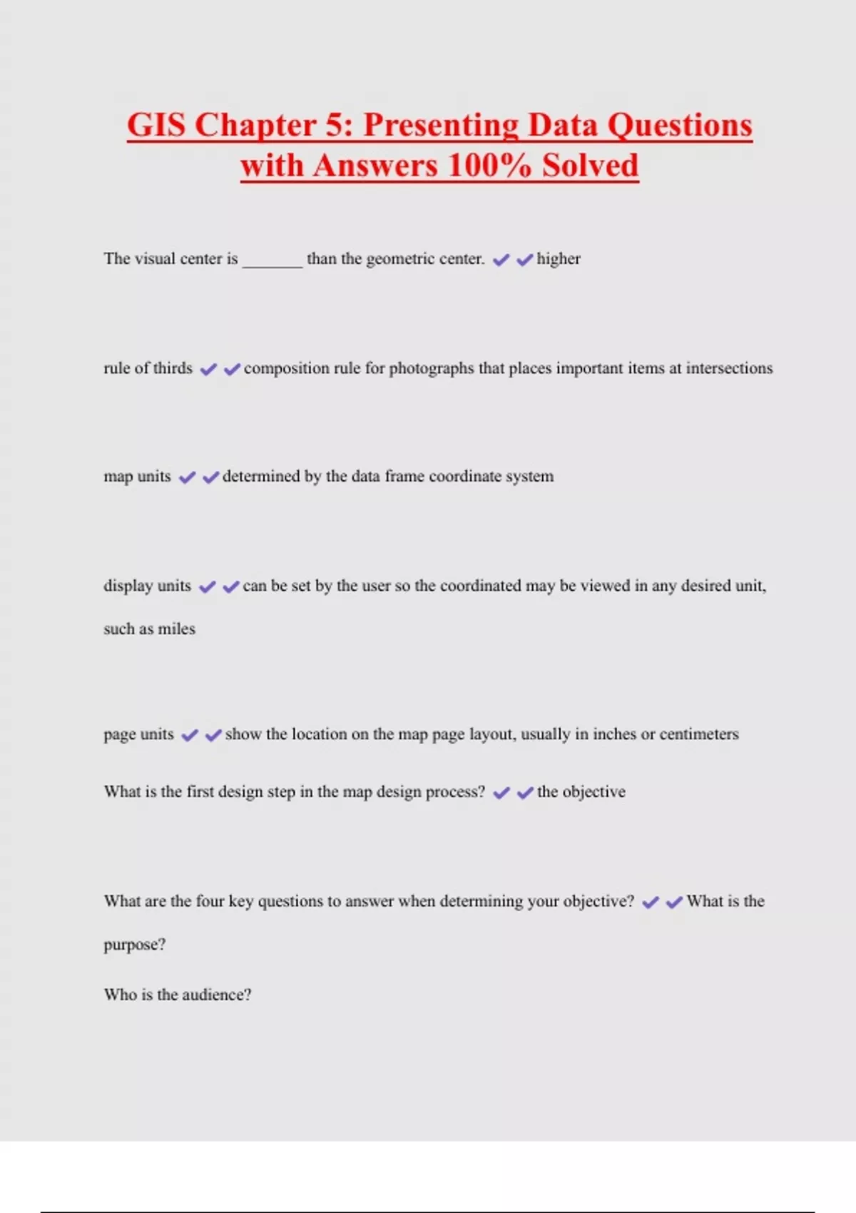 GIS Chapter 5: Presenting Data Questions with Answers 100% Solved The visual center is _______ than the geometric center. higher rule of thirds composition rule for photographs that places important items at intersections map units determined by the data frame coordinate system display units can be set by the user so the coordinated may be viewed in any desired unit, such as miles page units show the location on the map page layout, usually in inches or centimeters What is the first design step in the map design process? the objective