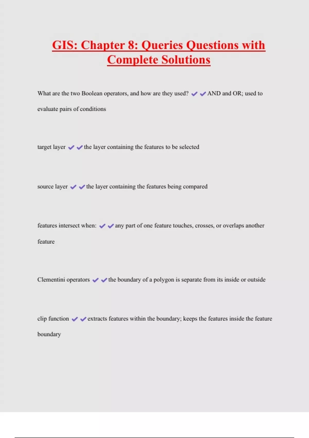 GIS: Chapter 8: Queries Questions with Complete Solutions What are the two Boolean operators, and how are they used? AND and OR; used to evaluate pairs of conditions target layer the layer containing the features to be selected source layer the layer containing the features being compared