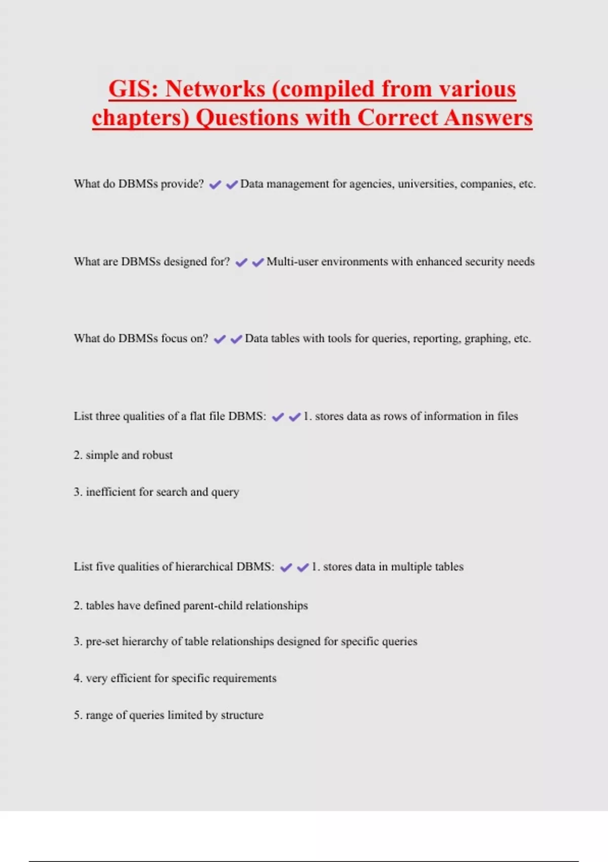 GIS: Networks (compiled from various chapters) Questions with Correct Answers What do DBMSs provide? Data management for agencies, universities, companies, etc. What are DBMSs designed for? Multi-user environments with enhanced security needs What do DBMSs focus on? Data tables with tools for queries, reporting, graphing, etc