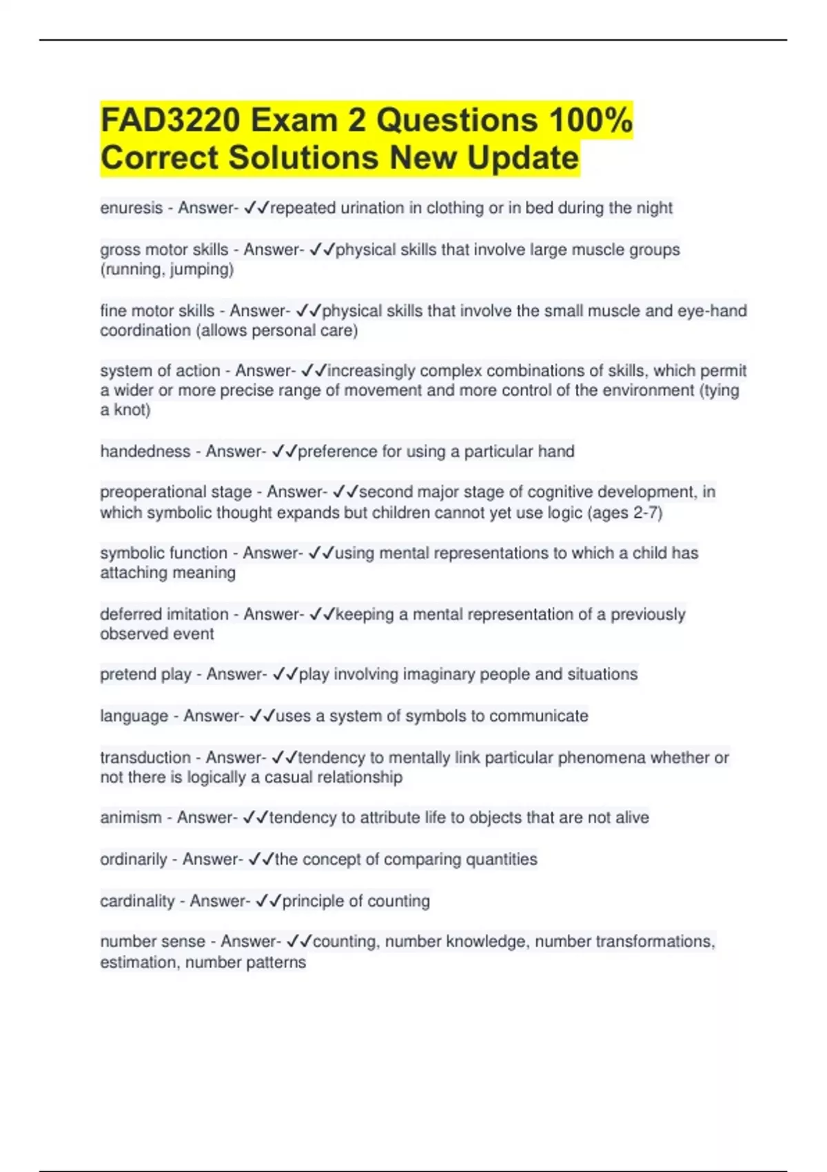 FAD3220 Exam 2 Questions 100% Correct Solutions New Update enuresis - Answer- repeated urination in clothing or in bed during the night gross motor skills - Answer- physical skills that involve large muscle groups (running, jumping) fine motor skills - Answer- physical skills that involve the small muscle and eye-hand coordination (allows personal care) system of action - Answer- increasingly complex combinations of skills, which permit a wider or more precise range of movement and more control of the environment (tying a knot) handedness - Answer- preference for using a particular hand preoperational stage - Answer- second major stage of cognitive development, in which symbolic thought expands but children cannot yet use logic (ages 2-7) symbolic function - Answer- using mental representations to which a child has attaching meaning deferred imitation - Answer- keeping a mental representation of a previously observed event pretend play - Answer- play involving imaginary people and situations language - Answer- uses a system of symbols to communicate transduction - Answer- tendency to mentally link particular phenomena whether or not there is logically a casual relationship animism - Answer- tendency to attribute life to objects that are not alive ordinarily - Answer- the concept of comparing quantities cardinality - Answer- principle of counting number sense - Answer- counting, number knowledge, number transformations, estimation, number patterns centration - Answer- the tendency of children to focus on one aspect of a situation and neglect others decenter - Answer- to think simultaneously about several aspects of a situation egocenterism - Answer- inability to consider another person's point of view conservations - Answer- the fact that two things that are equal remain so if their appearance is altered as long as nothing is taken away or added irreversibility - Answer- failure to understand that an operation can go in two or more directions encoding - Answer- process by which info is prepared for long-term storage and later retrieval storage - Answer- retention of info in memory for future self retrieval - Answer- process by which info is accessed or recalled from memory storage sensory memory - Answer- temporary holding tank for incoming sensory info working memory - Answer- short-term storage of info being actively processed executive function - Answer- conscious control of thoughts, actions, and emotions to accomplish goals or solve problems central executive - Answer- element of working memory that controls the processing of info (encodes for transfer of long-term memory) long-term memory - Answer- storage of virtually unlimited capacity that holds info for long periods of time recognition - Answer- the ability to identify a previously encountered stimulus recall - Answer- the ability to reproduce knowledge from memory generic memory - Answer- memory that produces scripts of familiar routines to guide behavior