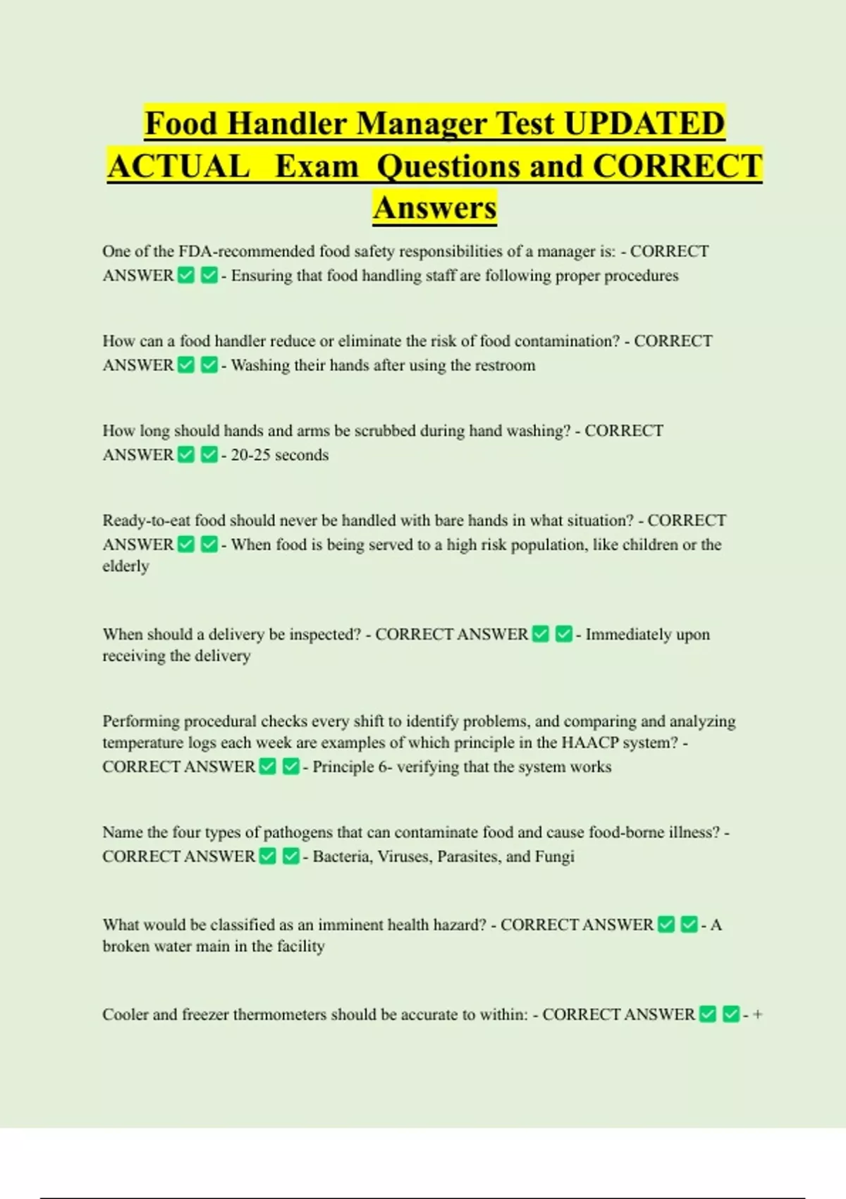 Food Handler Manager Test UPDATED ACTUAL Exam Questions and CORRECT Answers One of the FDA-recommended food safety responsibilities of a manager is: - CORRECT ANSWER - Ensuring that food handling staff are following proper procedures How can a food handler reduce or eliminate the risk of food contamination? - CORRECT ANSWER - Washing their hands after using the restroom How long should hands and arms be scrubbed during hand washing? - CORRECT ANSWER - 20-25 second