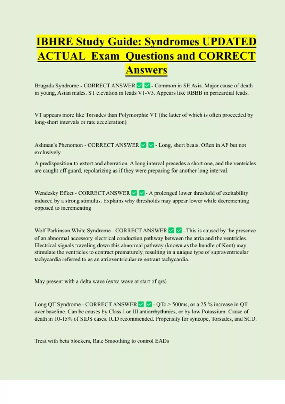 IBHRE Study Guide: Syndromes UPDATED ACTUAL Exam Questions and CORRECT Answers Brugada Syndrome - CORRECT ANSWER - Common in SE Asia. Major cause of death in young, Asian males. ST elevation in leads V1-V3. Appears like RBBB in pericardial leads. VT appears more like Torsades than Polymorphic VT (the latter of which is often proceeded by long-short intervals or rate acceleration) Ashman's Phenomon - CORRECT ANSWER exclusively. - Long, short beats. Often in AF but not A predisposition to extort and aberration. A long interval precedes a short one, and the ventricles are caught off guard, repolarizing as if they were preparing for another long interva