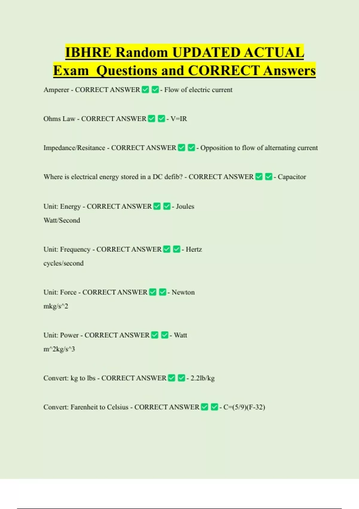 IBHRE Random UPDATED ACTUAL Exam Questions and CORRECT Answers Amperer - CORRECT ANSWER Ohms Law - CORRECT ANSWER - Flow of electric current - V=IR Impedance/Resitance - CORRECT ANSWER - Opposition to flow of alternating current Where is electrical energy stored in a DC defib? - CORRECT ANSWER Unit: Energy - CORRECT ANSWER Watt/Second Unit: Frequency - CORRECT ANSWER cycles/second Unit: Force - CORRECT ANSWER mkg/s^2 Unit: Power - CORRECT ANSWER m^2kg/s^3 Convert: kg to lbs - CORRECT ANSWER - Joules - Hertz - Newton - Watt - 2.2lb/kg Convert: Farenheit to Celsius - CORRECT ANSWER - C=(5/9)(F-32) - Capacitor