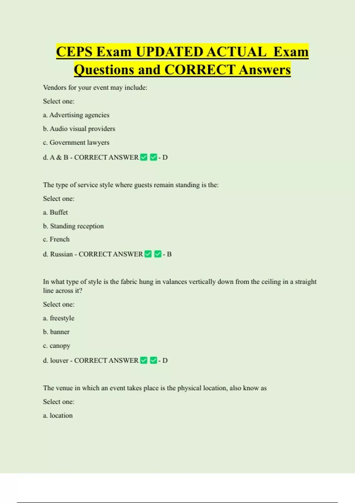 CEPS Exam UPDATED ACTUAL Exam Questions and CORRECT Answers Vendors for your event may include: Select one: a. Advertising agencies b. Audio visual providers c. Government lawyers d. A & B - CORRECT ANSWER - D The type of service style where guests remain standing is the: