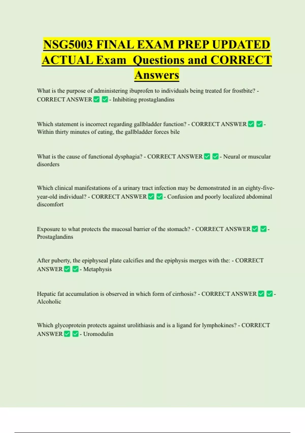 NSG5003 FINAL EXAM PREP UPDATED ACTUAL Exam Questions and CORRECT Answers What is the purpose of administering ibuprofen to individuals being treated for frostbite? - CORRECT ANSWER - Inhibiting prostaglandins Which statement is incorrect regarding gallbladder function? - CORRECT ANSWER Within thirty minutes of eating, the gallbladder forces bile What is the cause of functional dysphagia? - CORRECT ANSWER disorders - - Neural or muscular