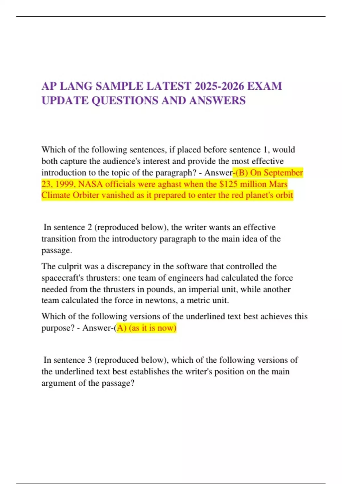 AP LANG SAMPLE LATEST EXAM UPDATE QUESTIONS AND ANSWERS