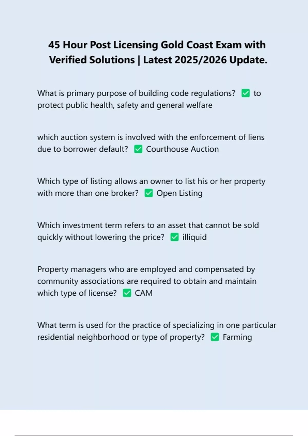 45 Hour Post Licensing Gold Coast Exam with Verified Solutions | Latest 2025/2026 Update.