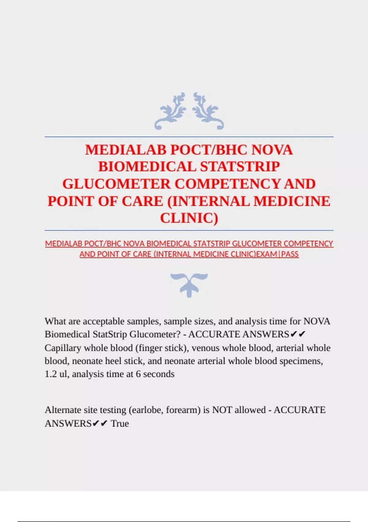 MEDIALAB POCT/BHC NOVA BIOMEDICAL STATSTRIP GLUCOMETER COMPETENCY AND POINT OF CARE (INTERNAL MEDICINE CLINIC)EXAM|PASS