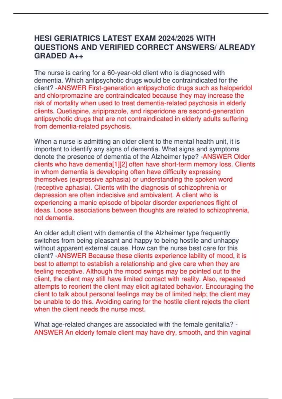HESI GERIATRICS LATEST EXAM 2024/2025 QUESTIONS AND VERIFIED CORRECT ANSWERS/ ALREADY GRADED A++ HESI GERIATRICS LATEST EXAM 2024/2025 QUESTIONS AND VERIFIED CORRECT ANSWERS/ ALREADY GRADED A++