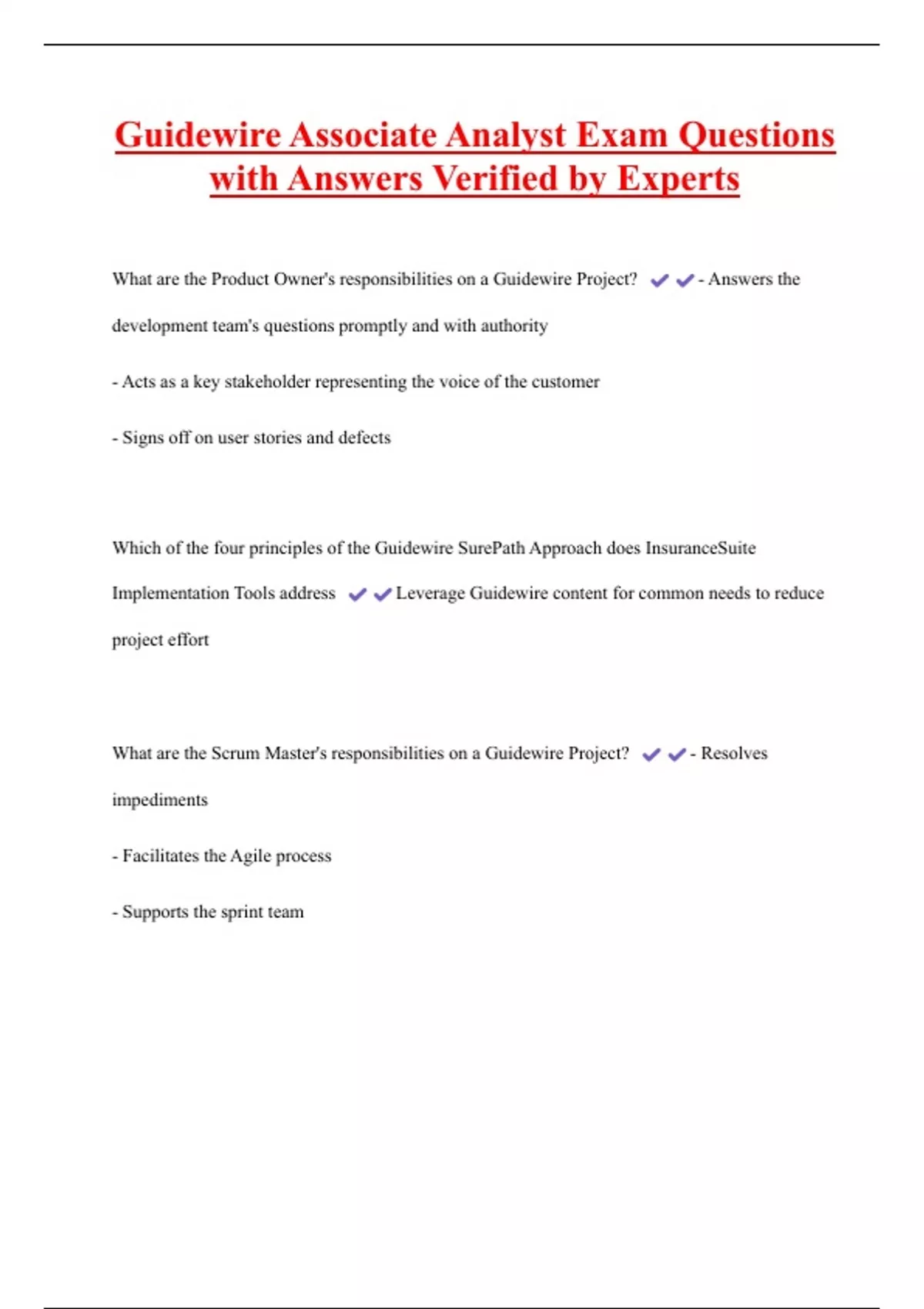 Guidewire Associate Analyst Exam Questions with Answers Verified by Experts What are the Product Owner's responsibilities on a Guidewire Project? - Answers the development team's questions promptly and with authority - Acts as a key stakeholder representing the voice of the customer - Signs off on user stories and defects Which of the four principles of the Guidewire SurePath Approach does InsuranceSuite Implementation Tools address Leverage Guidewire content for common needs to reduce project effort