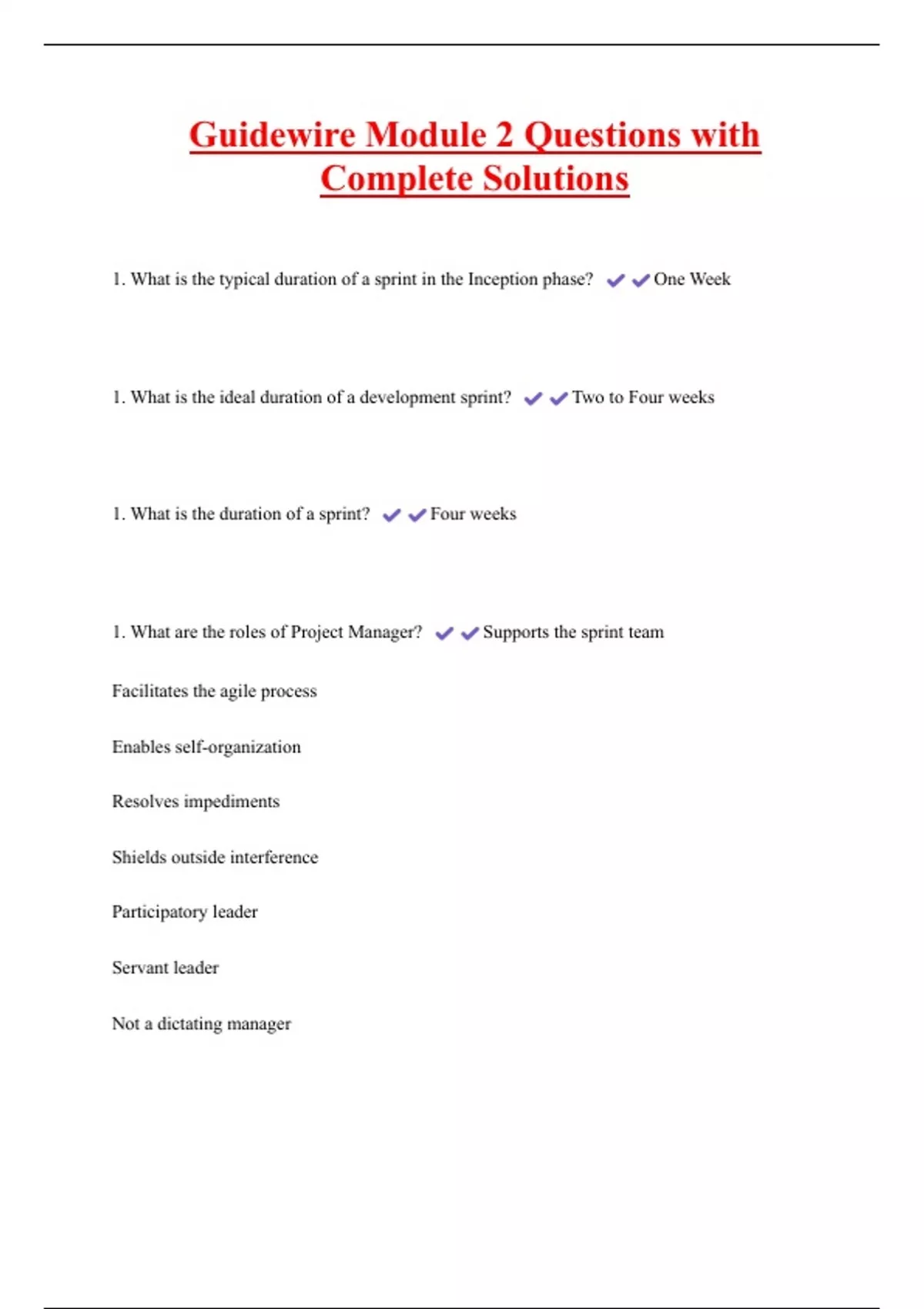 Guidewire Module 2 Questions with Complete Solutions 1. What is the typical duration of a sprint in the Inception phase? One Week 1. What is the ideal duration of a development sprint? Two to Four weeks 1. What is the duration of a sprint? Four weeks