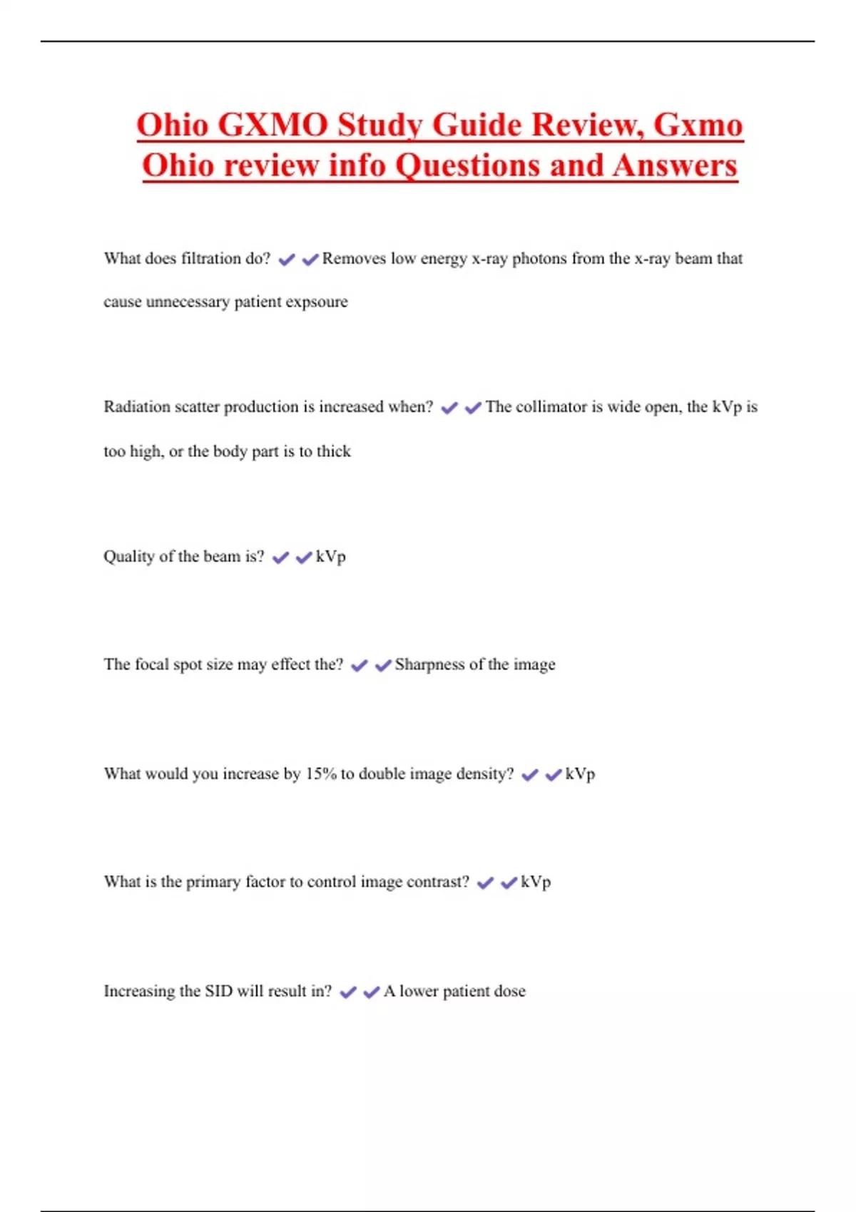 Ohio GXMO Study Guide Review, Gxmo Ohio review info Questions and Answers What does filtration do? Removes low energy x-ray photons from the x-ray beam that cause unnecessary patient expsoure Radiation scatter production is increased when? The collimator is wide open, the kVp is too high, or the body part is to thick Quality of the beam is? kVp