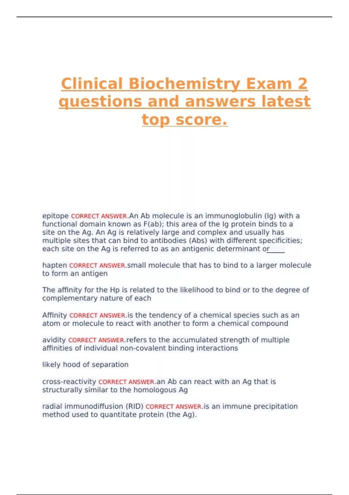 Clinical Biochemistry Exam 2 questions and answers latest top score.