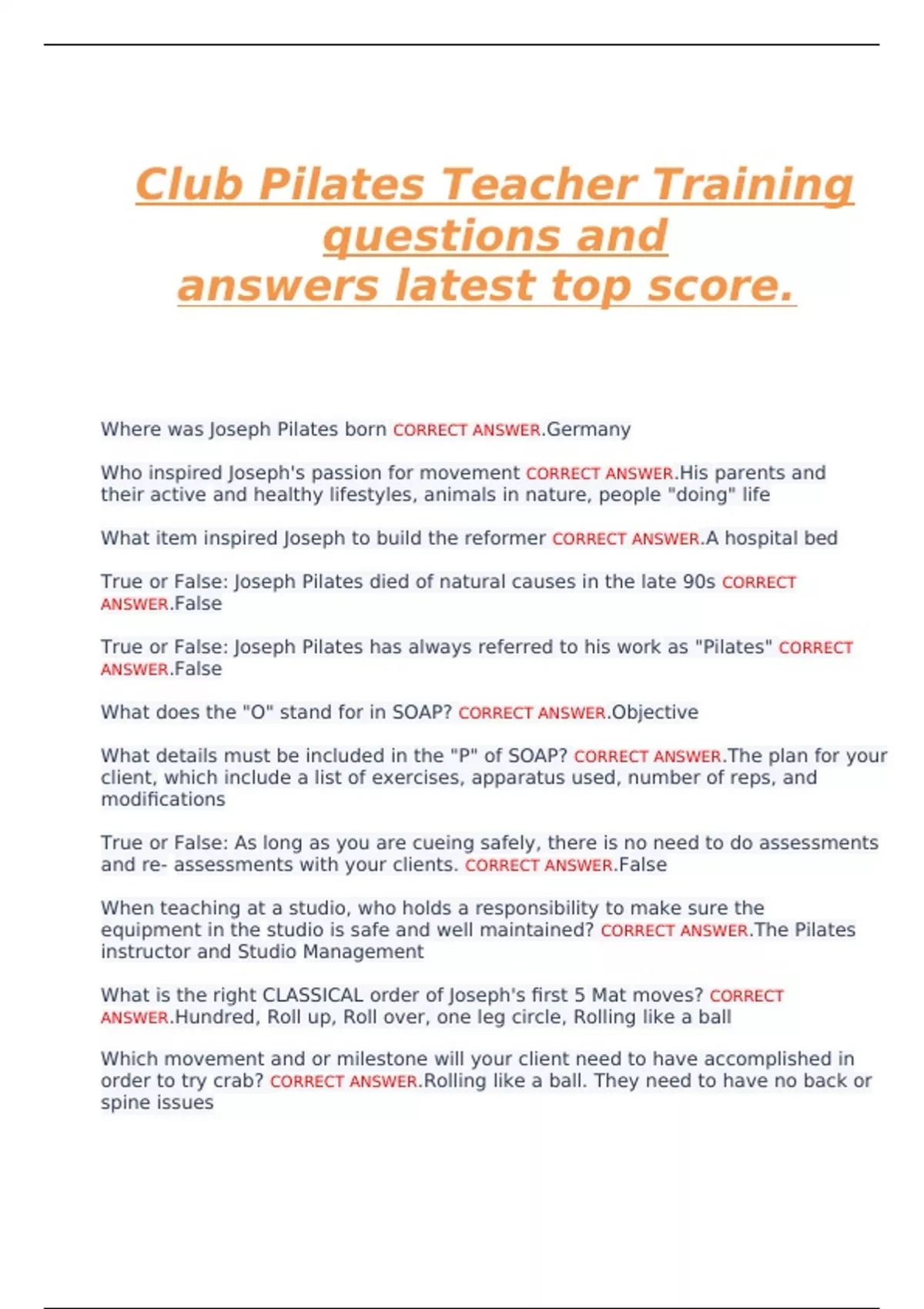 Club Pilates Teacher Training questions and answers latest top score.
