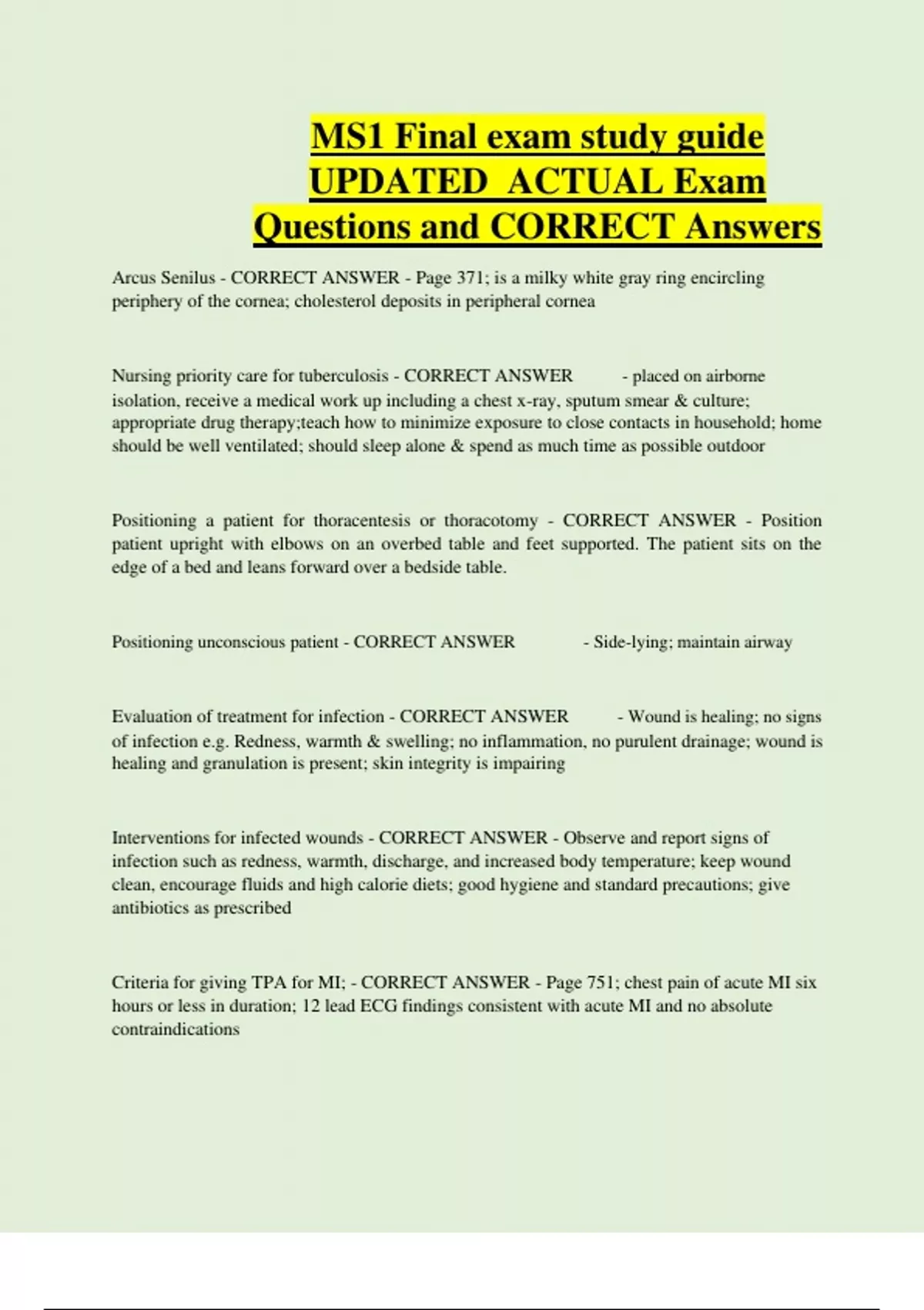 MS1 Final exam study guide UPDATED ACTUAL Exam Questions and CORRECT Answers Arcus Senilus - CORRECT ANSWER - Page 371; is a milky white gray ring encircling periphery of the cornea; cholesterol deposits in peripheral cornea Nursing priority care for tuberculosis - CORRECT ANSWER - placed on airborne isolation, receive a medical work up including a chest x-ray, sputum smear & culture; appropriate drug therapy;teach how to minimize exposure to close contacts in household; home should be well ventilated; should sleep alone & spend as much time as possible outdoor
