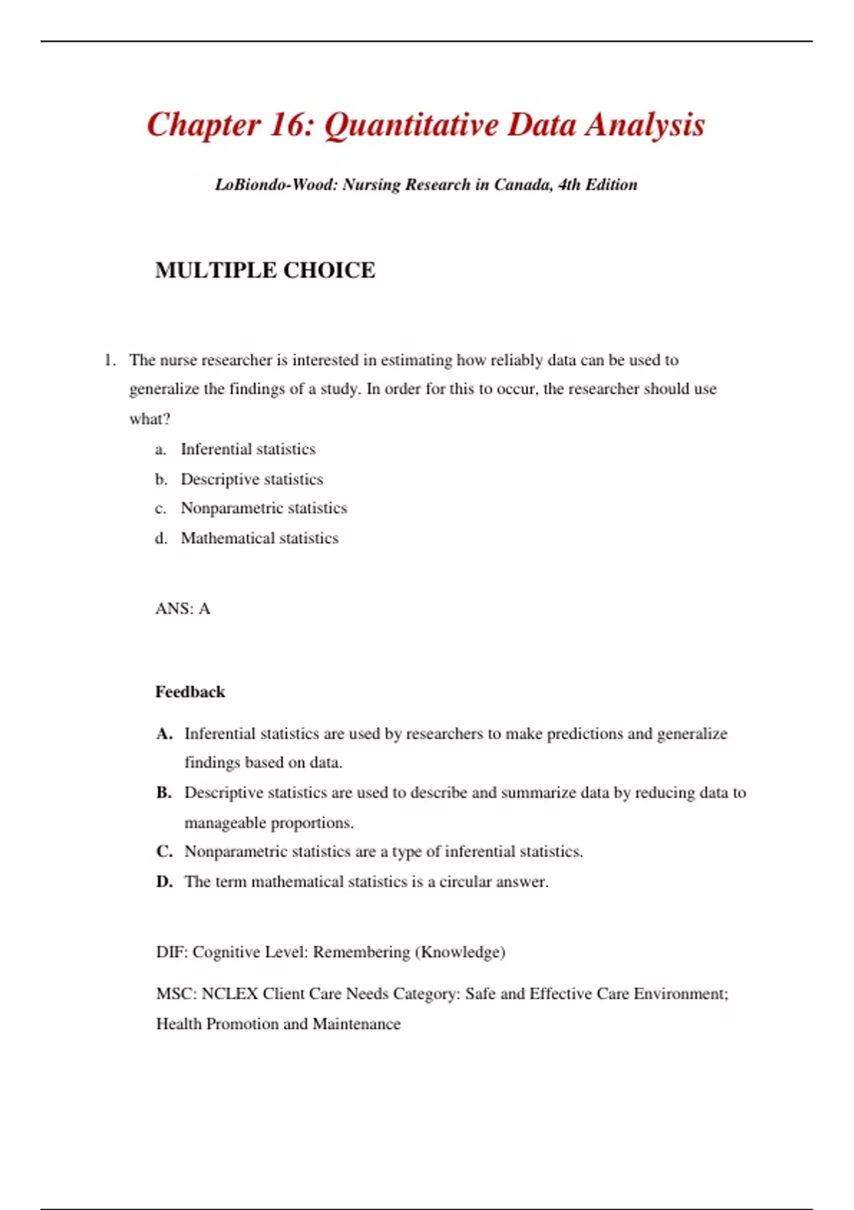 LoBiondo-Wood: Nursing Research in Canada, 4th Edition MULTIPLE CHOICE 1. The nurse researcher is interested in estimating how reliably data can be used to generalize the findings of a study. In order for this to occur, the researcher should use what? a. Inferential statistics b. Descriptive statistics c. Nonparametric statistics d. Mathematical statistics ANS: A Feedback A. Inferential statistics are used by researchers to make predictions and generalize findings based on data. B. Descriptive statistics are used to describe and summarize data by reducing data to manageable proportions. C. Nonparametric statistics are a type of inferential statistics. D. The term mathematical statistics is a circular answer. DIF: Cognitive Level: Remembering (Knowledge) MSC: NCLEX Client Care Needs Category: Safe and Effective Care Environment; Health Promotion and Maintenance 2. The nurse researcher is interested in describing and summarizing the characteristics of the sample used in the research study. In order for this to occur, the researcher should use what? a. Inferential statistics b. Descriptive statistics c. Nonparametric statistics d. Mathematical statistics ANS: B Feedback A. Inferential statistics are used by researchers to make predictions and generalize finding based on data. B. Descriptive statistics are used to describe and summarize data by reducing data to manageable proportions. C. Nonparametric statistics are a type of inferential statistics. D. The term mathematical statistics is a circular answer. DIF: Cognitive Level: Remembering (Knowledge) MSC: NCLEX Client Care Needs Category: Safe and Effective Care Environment; Health Promotion and Maintenance 3. A nurse researcher would opt to use measures of central tendency in which case? a. When there is a need to describe how reliably the findings can be generalized b. When there is a need to describe how much dispersion is in the sample c. When there is a need to describe the accuracy of predictions made d. When there is a need to describe the average member of the sample