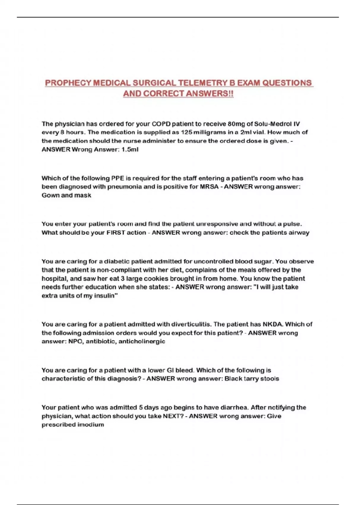 PROPHECY MEDICAL SURGICAL TELEMETRY B EXAM QUESTIONS AND CORRECT ANSWERS!!