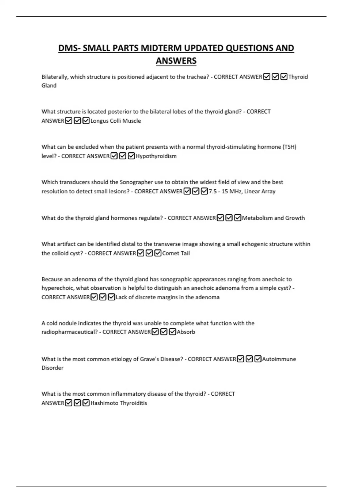 DMS- SMALL PARTS MIDTERM UPDATED QUESTIONS AND ANSWERS Bilaterally, which structure is positioned adjacent to the trachea? - CORRECT ANSWERThyroid Gland What structure is located posterior to the bilateral lobes of the thyroid gland? - CORRECT ANSWERLongus Colli Muscle