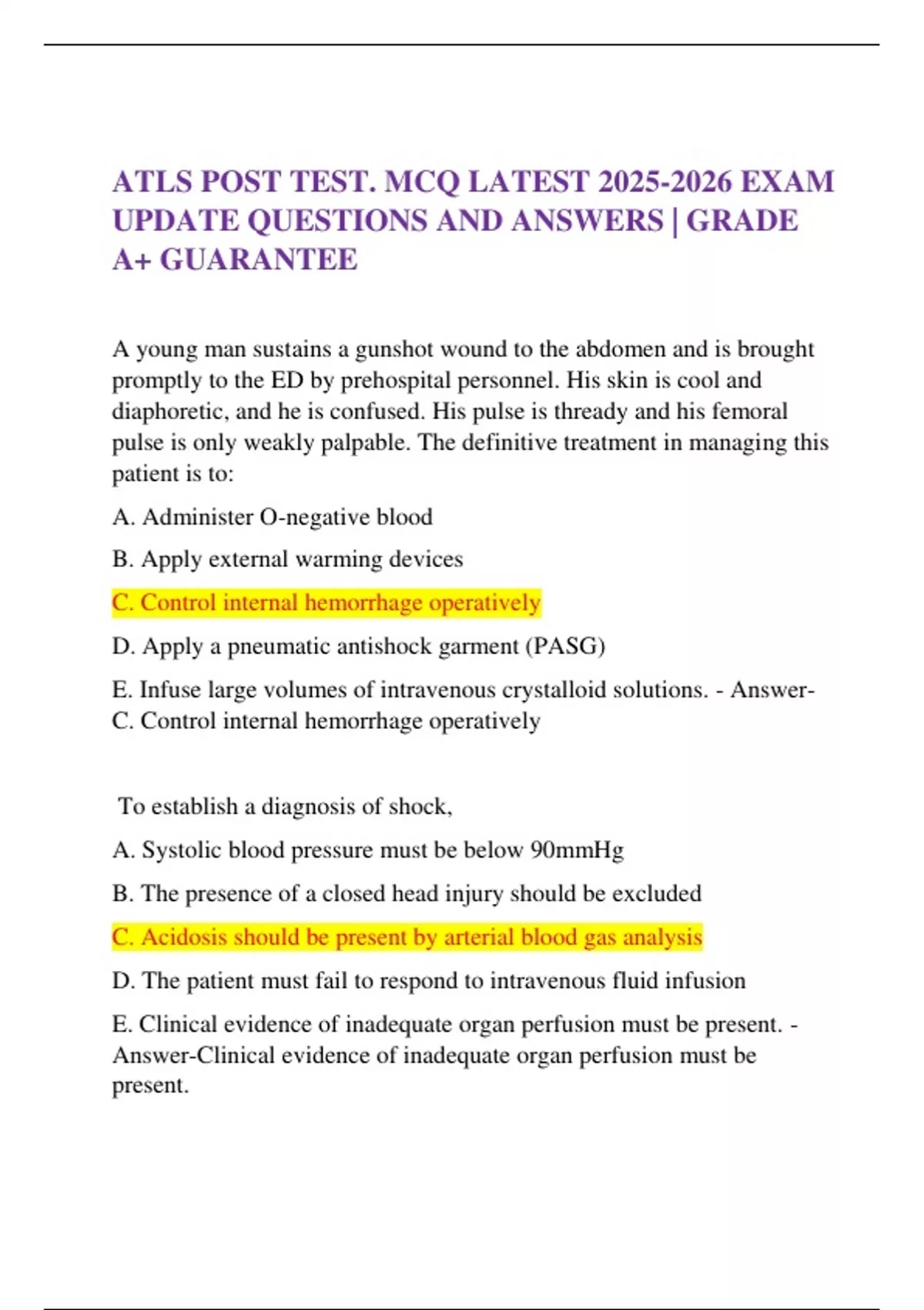ATLS POST TEST. MCQ LATEST 2025-2026 EXAM