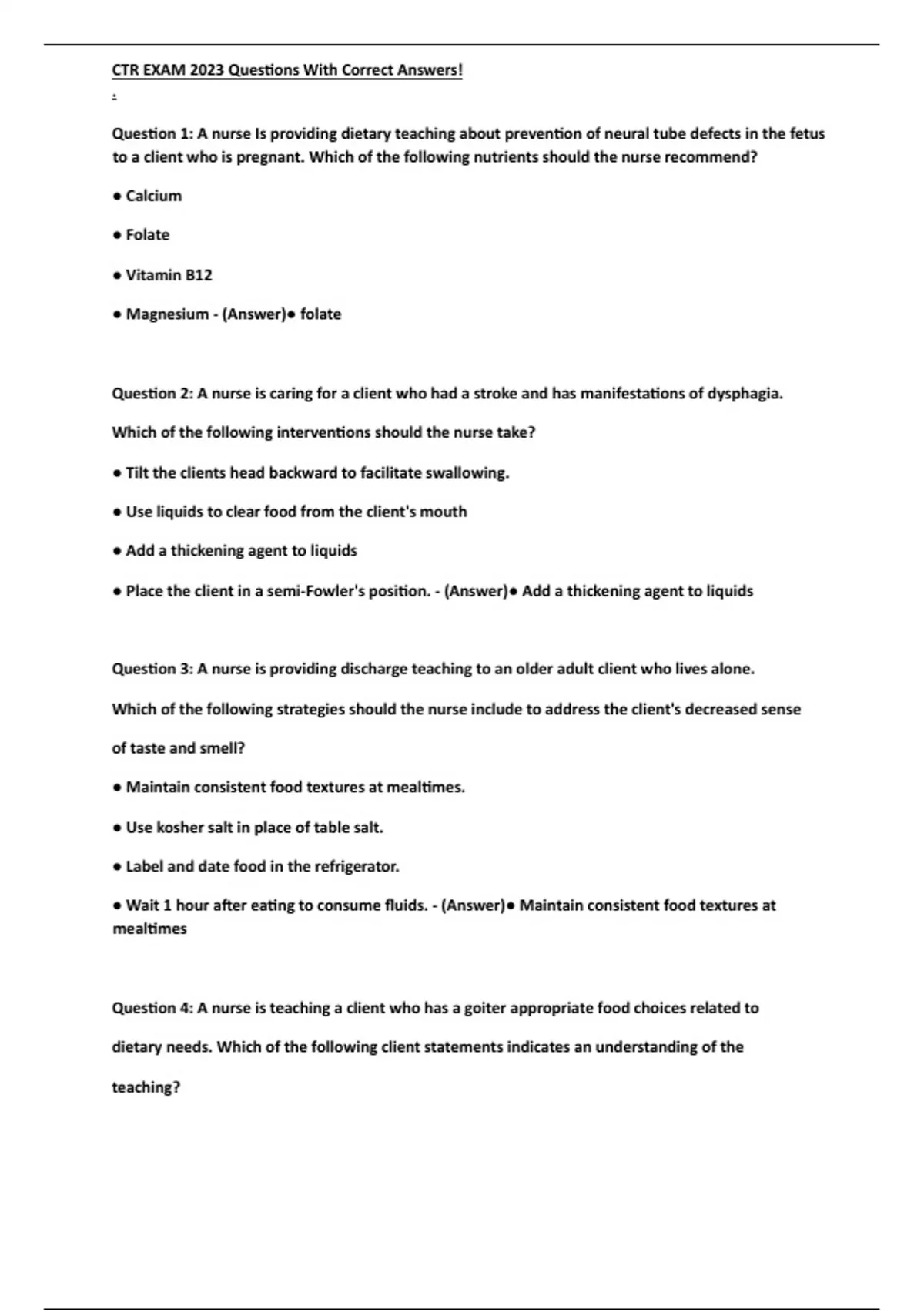 Question 2: A nurse is caring for a client who had a stroke and has manifestations of dysphagia.