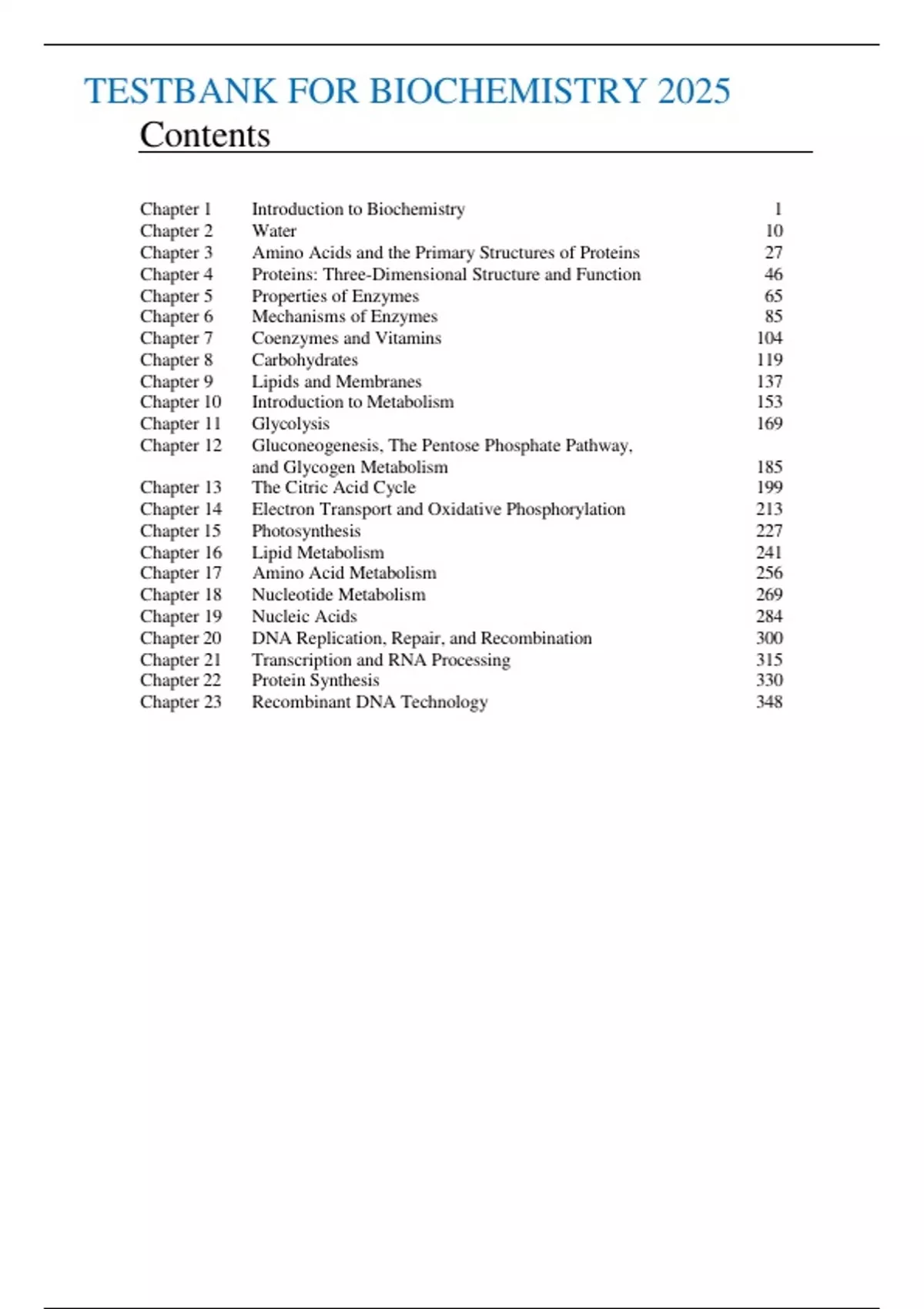 TESTBANK FOR BIOCHEMISTRY 2025 Contents Chapter 1 Introduction to Biochemistry 1 Chapter 2 Water 10 Chapter 3 Amino Acids and the Primary Structures of Proteins 27 Chapter 4 Proteins: Three-Dimensional Structure and Function 46 Chapter 5 Properties of Enzymes 65 Chapter 6 Mechanisms of Enzymes 85 Chapter 7 Coenzymes and Vitamins 104 Chapter 8 Carbohydrates 119 Chapter 9 Lipids and Membranes 137 Chapter 10 Introduction to Metabolism 153 Chapter 11 Glycolysis 169 Chapter 12 Gluconeogenesis, The Pentose Phosphate Pathway, and Glycogen Metabolism 185 Chapter 13 The Citric Acid Cycle 199 Chapter 14 Electron Transport and Oxidative Phosphorylation 213 Chapter 15 Photosynthesis 227 Chapter 16 Lipid Metabolism 241 Chapter 17 Amino Acid Metabolism 256 Chapter 18 Nucleotide Metabolism 269 Chapter 19 Nucleic Acids 284 Chapter 20 DNA Replication, Repair, and Recombination 300 Chapter 21 Transcription and RNA Processing 315 Chapter 22 Protein Synthesis 330 Chapter 23 Recombinant DNA Technology 348
