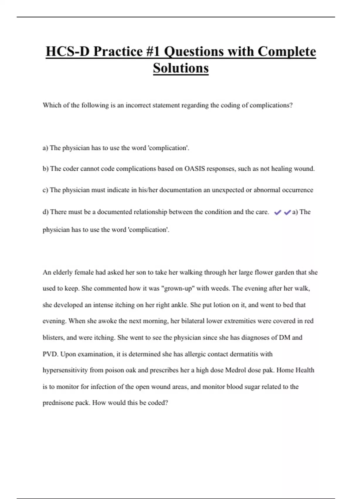 HCS-D Practice #1 Questions with Complete Solutions Which of the following is an incorrect statement regarding the coding of complications? a) The physician has to use the word 'complication'. b) The coder cannot code complications based on OASIS responses, such as not healing wound. c) The physician must indicate in his/her documentation an unexpected or abnormal occurrence d) There must be a documented relationship between the condition and the care. a) The physician has to use the word 'complication