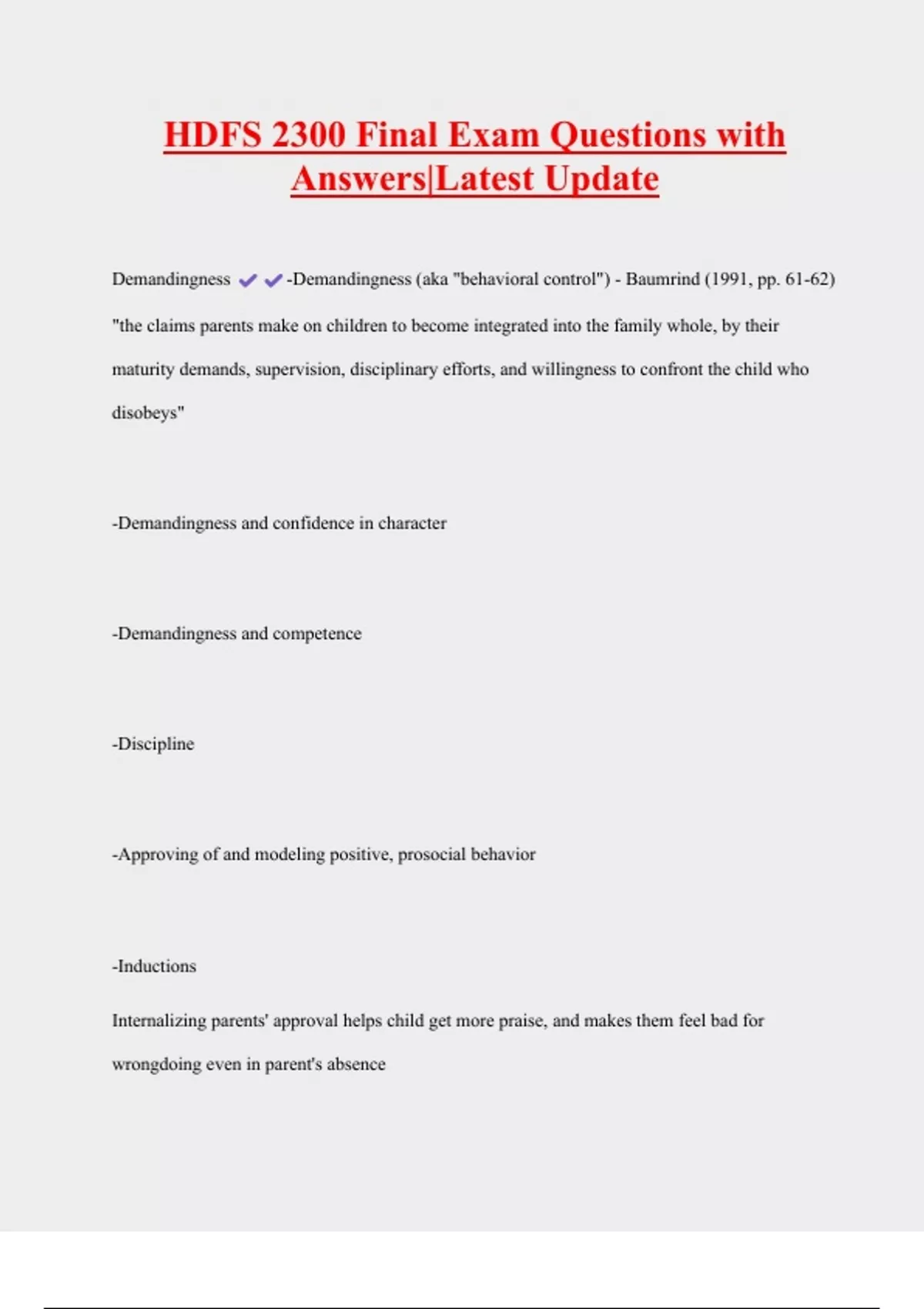 HDFS 2300 Final Exam Questions with Answers|Latest Update Demandingness -Demandingness (aka "behavioral control") - Baumrind (1991, pp. 61-62) "the claims parents make on children to become integrated into the family whole, by their maturity demands, supervision, disciplinary efforts, and willingness to confront the child who disobeys" -Demandingness and confidence in character -Demandingness and competence -Discipline -Approving of and modeling positive, prosocial behavior -Inductions Internalizing parents' approval helps child get more praise, and makes them feel bad for wrongdoing even in parent's absence