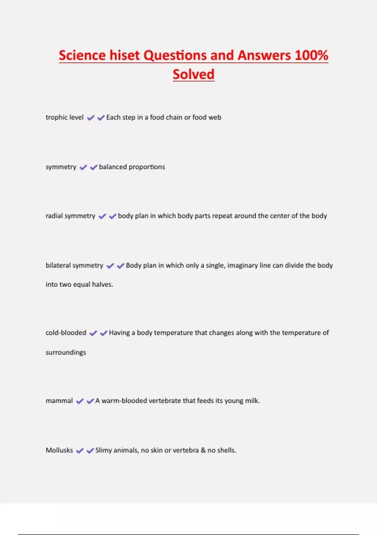 Science hiset Questions and Answers 100% Solved trophic level Each step in a food chain or food web symmetry balanced proportions radial symmetry body plan in which body parts repeat around the center of the body