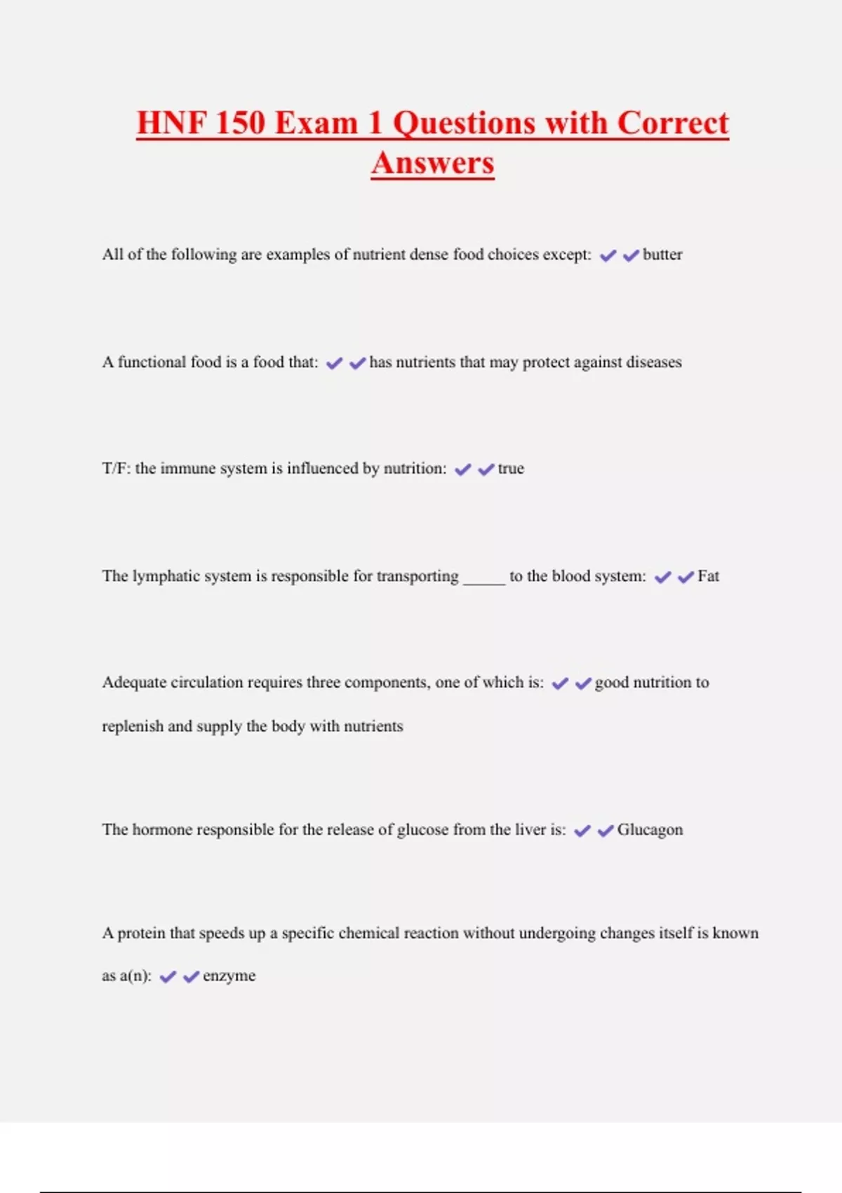 HNF 150 Exam 1 Questions with Correct Answers All of the following are examples of nutrient dense food choices except: butter A functional food is a food that: has nutrients that may protect against diseases T/F: the immune system is influenced by nutrition: true
