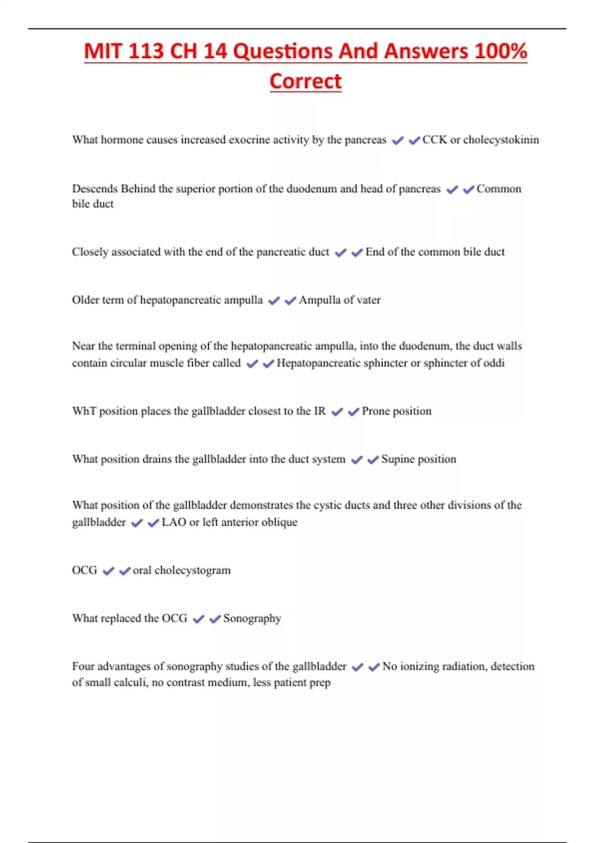 MIT 113 CH 14 Questions And Answers 100% Correct What hormone causes increased exocrine activity by the pancreas CCK or cholecystokinin Descends Behind the superior portion of the duodenum and head of pancreas Common bile duct Closely associated with the end of the pancreatic duct End of the common bile duct Older term of hepatopancreatic ampulla Ampulla of vater Near the terminal opening of the hepatopancreatic ampulla, into the duodenum, the duct walls contain circular muscle fiber called Hepatopancreatic sphincter or sphincter of oddi