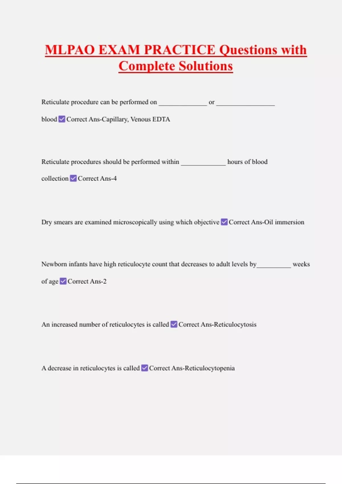 MLPAO EXAM PRACTICE Questions with Complete Solutions Reticulate procedure can be performed on ______________ or _________________ blood Correct Ans-Capillary, Venous EDTA Reticulate procedures should be performed within _____________ hours of blood collection Correct Ans-4 Dry smears are examined microscopically using which objective Correct Ans-Oil immersion