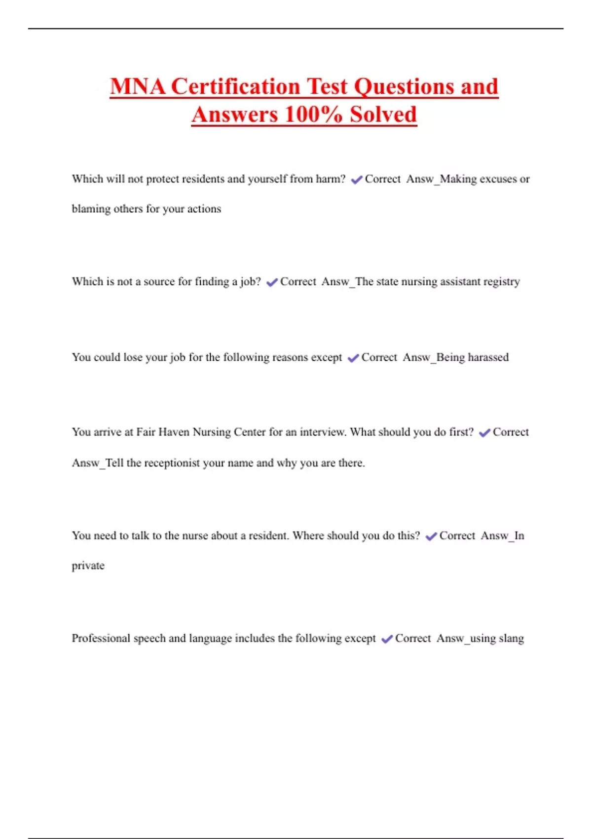 MNA Certification Test Questions and Answers 100% Solved Which will not protect residents and yourself from harm? Correct Answ_Making excuses or blaming others for your actions Which is not a source for finding a job? Correct Answ_The state nursing assistant registry You could lose your job for the following reasons except Correct Answ_Being harassed You arrive at Fair Haven Nursing Center for an interview. What should you do first? Correct Answ_Tell the receptionist your name and why you are there