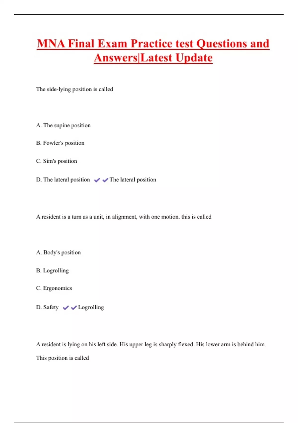 MNA Final Exam Practice test Questions and Answers|Latest Update The side-lying position is called A. The supine position B. Fowler's position C. Sim's position D. The lateral position The lateral position A resident is a turn as a unit, in alignment, with one motion. this is called A. Body's position B. Logrolling C. Ergonomics D. Safety Logrolling