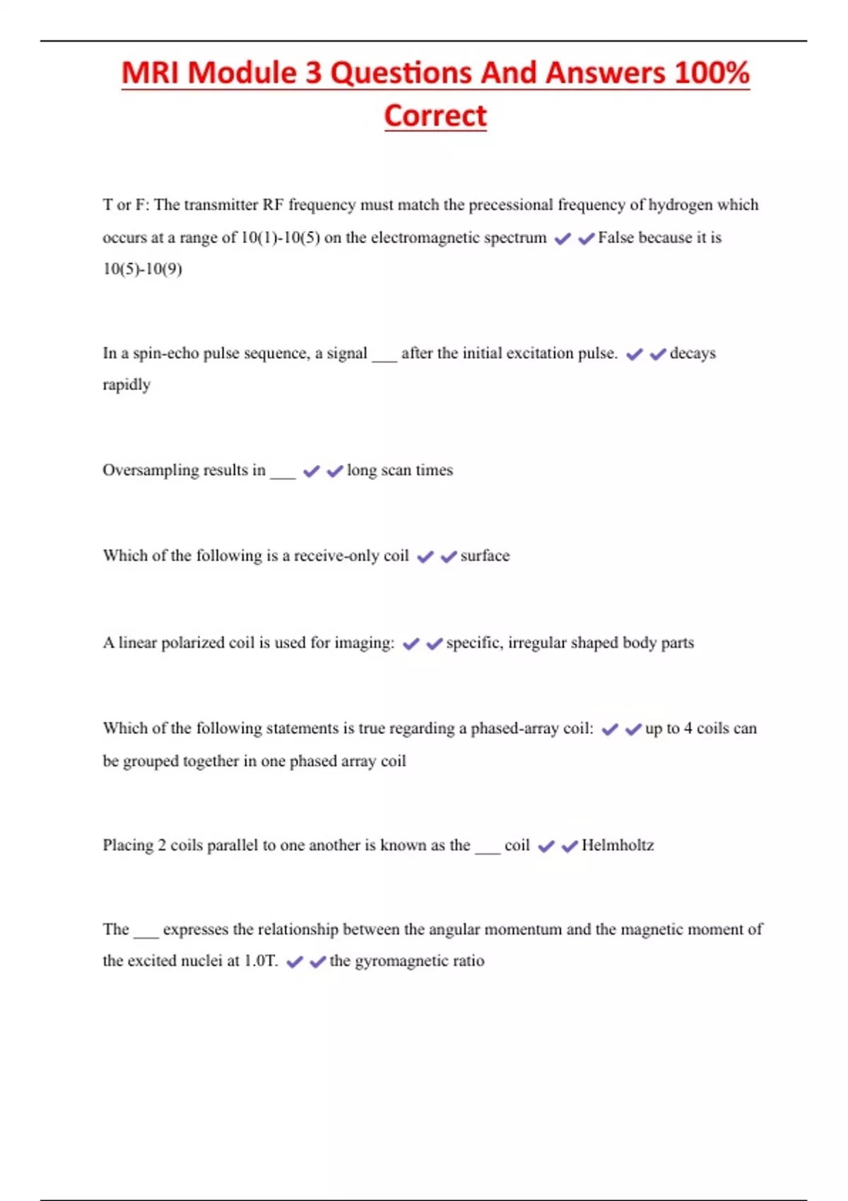 MRI Module 3 Questions And Answers 100% Correct T or F: The transmitter RF frequency must match the precessional frequency of hydrogen which occurs at a range of 10(1)-10(5) on the electromagnetic spectrum False because it is 10(5)-10(9) In a spin-echo pulse sequence, a signal ___ after the initial excitation pulse. decays rapidly Oversampling results in ___ long scan times