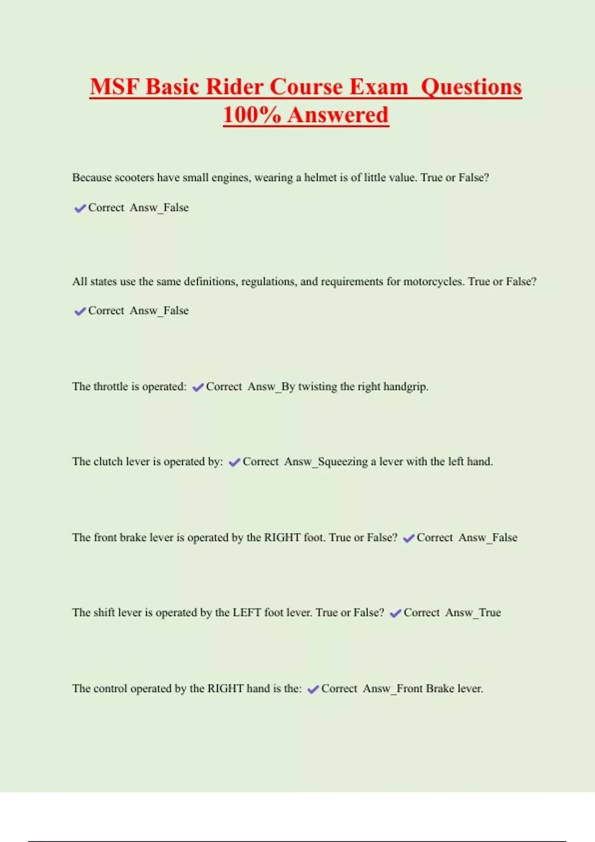 MSF Basic Rider Course Exam Questions 100% Answered Because scooters have small engines, wearing a helmet is of little value. True or False? Correct Answ_False All states use the same definitions, regulations, and requirements for motorcycles. True or False? Correct Answ_False The throttle is operated: Correct Answ_By twisting the right handgrip