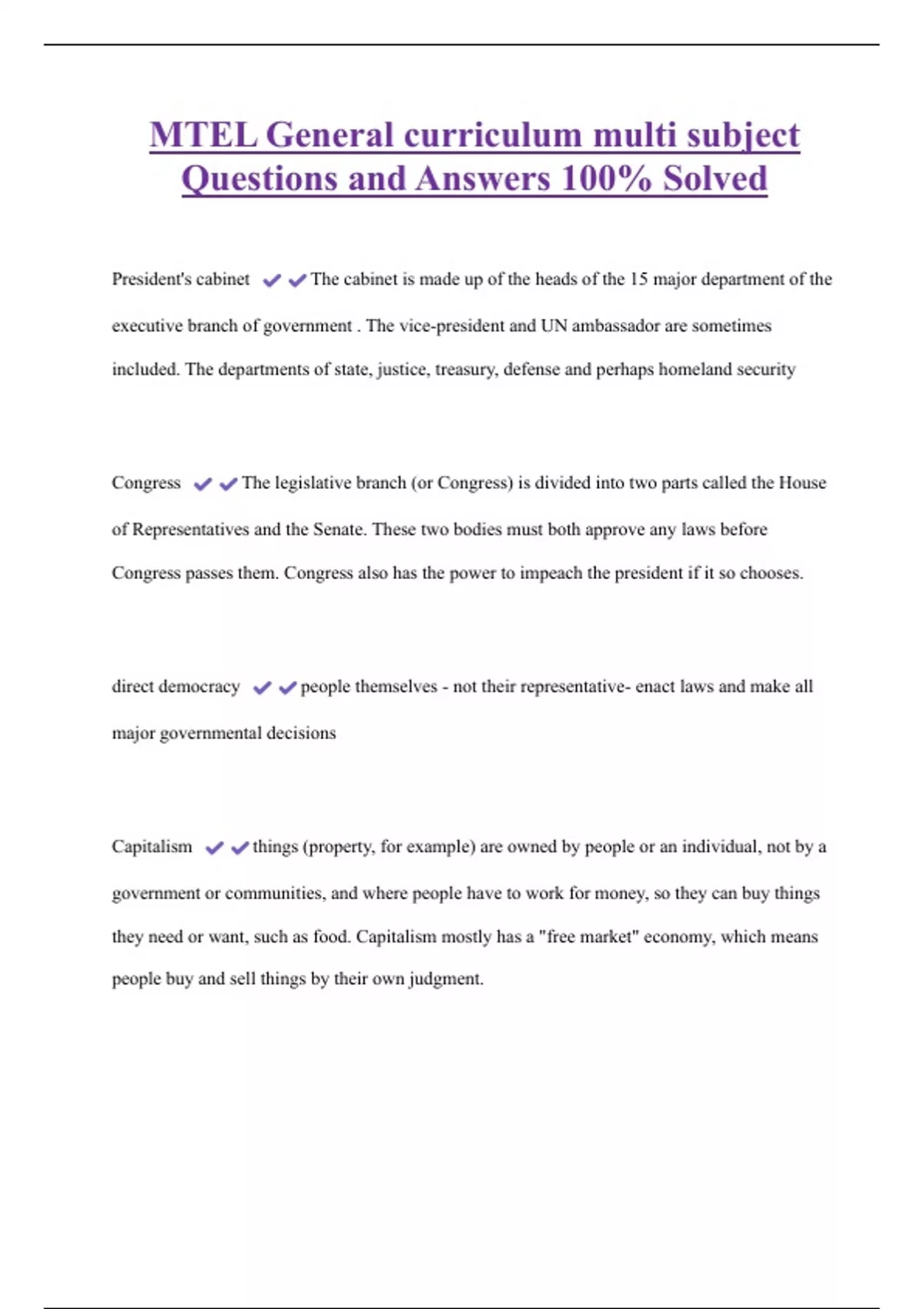 MTEL General curriculum multi subject Questions and Answers 100% Solved President's cabinet The cabinet is made up of the heads of the 15 major department of the executive branch of government . The vice-president and UN ambassador are sometimes included. The departments of state, justice, treasury, defense and perhaps homeland security Congress The legislative branch (or Congress) is divided into two parts called the House of Representatives and the Senate. These two bodies must both approve any laws before Congress passes them. Congress also has the power to impeach the president if it so chooses.