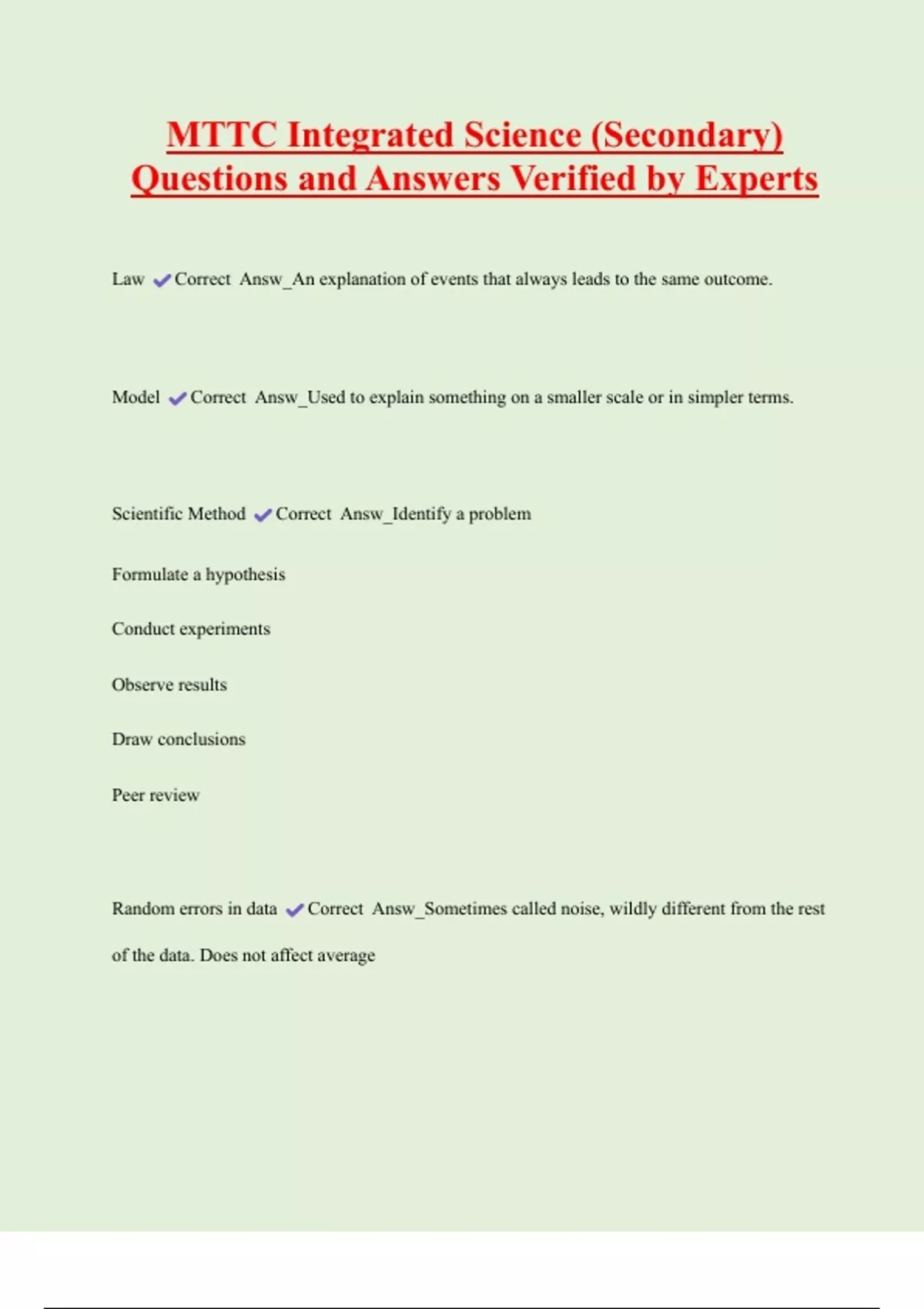 MTTC Integrated Science (Secondary) Questions and Answers Verified by Experts Law Correct Answ_An explanation of events that always leads to the same outcome. Model Correct Answ_Used to explain something on a smaller scale or in simpler terms. Scientific Method Correct Answ_Identify a problem Formulate a hypothesis Conduct experiments Observe results Draw conclusions Peer review