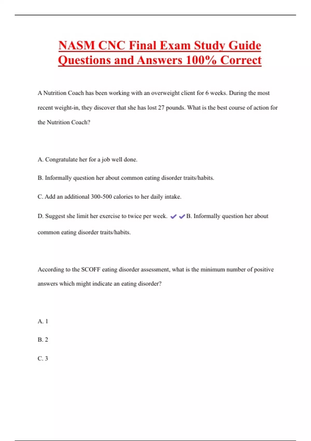 NASM CNC Final Exam Study Guide Questions and Answers 100% Correct A Nutrition Coach has been working with an overweight client for 6 weeks. During the most recent weight-in, they discover that she has lost 27 pounds. What is the best course of action for the Nutrition Coach? A. Congratulate her for a job well done. B. Informally question her about common eating disorder traits/habits. C. Add an additional 300-500 calories to her daily intake. D. Suggest she limit her exercise to twice per week. B. Informally question her about common eating disorder traits/habits.