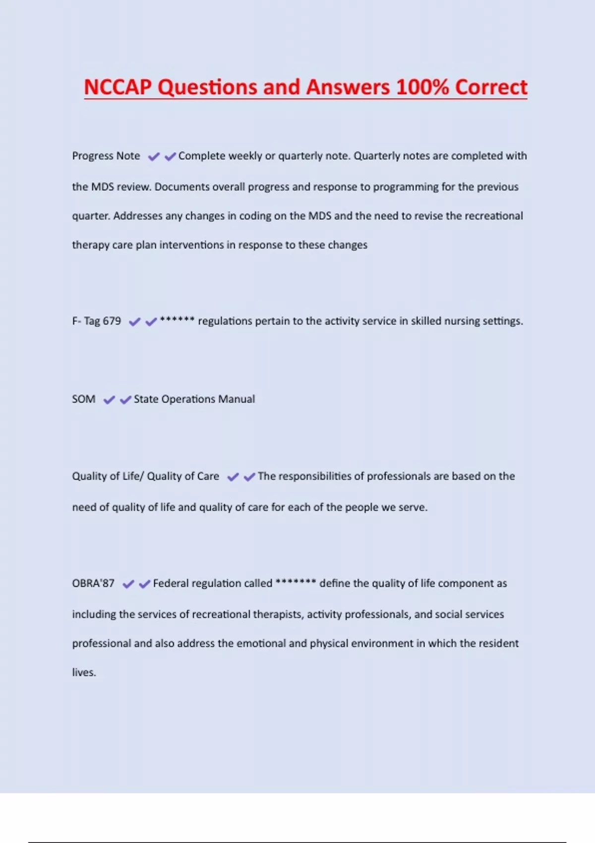 quarter. Addresses any changes in coding on the MDS and the need to revise the recreational