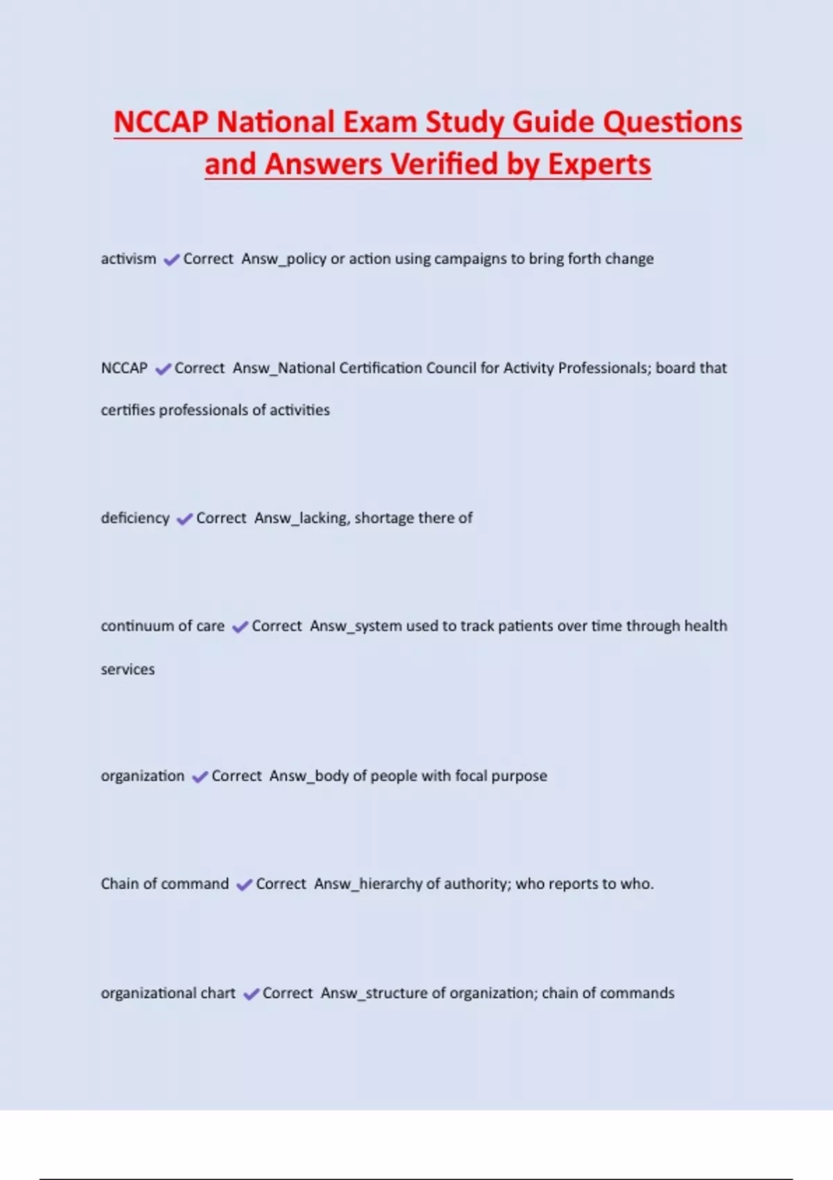 NCCAP National Exam Study Guide Questions and Answers Verified by Experts activism Correct Answ_policy or action using campaigns to bring forth change NCCAP Correct Answ_National Certification Council for Activity Professionals; board that certifies professionals of activities deficiency Correct Answ_lacking, shortage there of continuum of care Correct Answ_system used to track patients over time through health services
